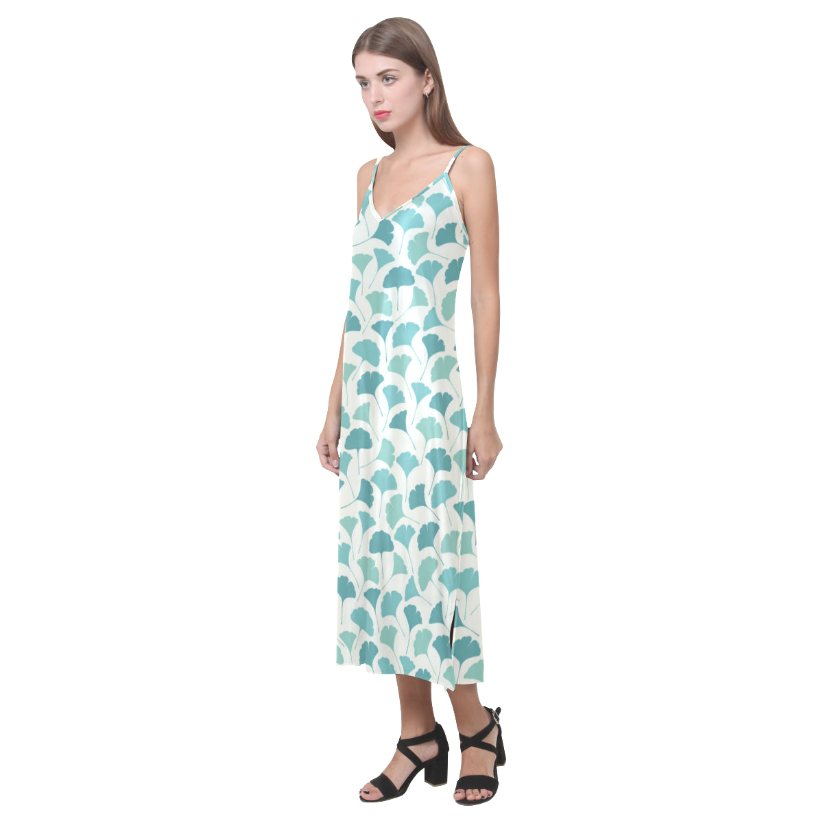 Green ginkgo leaves pattern V-Neck Open Fork Long Dress is a uniqued design and limited item. It made to order, hand printed, and sewn with love in our factory.