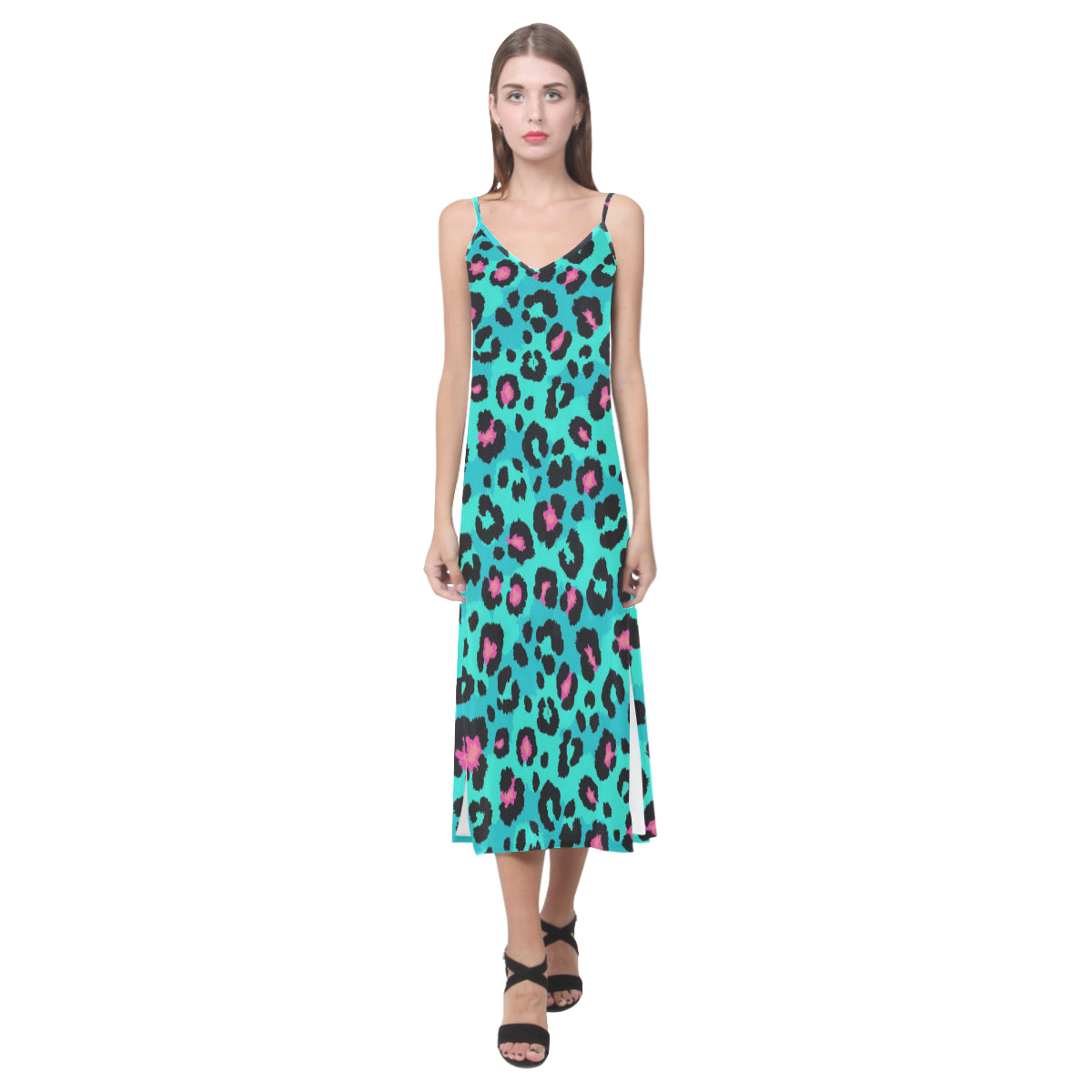 Green leopard skin print pattern V-Neck Open Fork Long Dress is a uniqued design and limited item. It made to order, hand printed, and sewn with love in our factory.