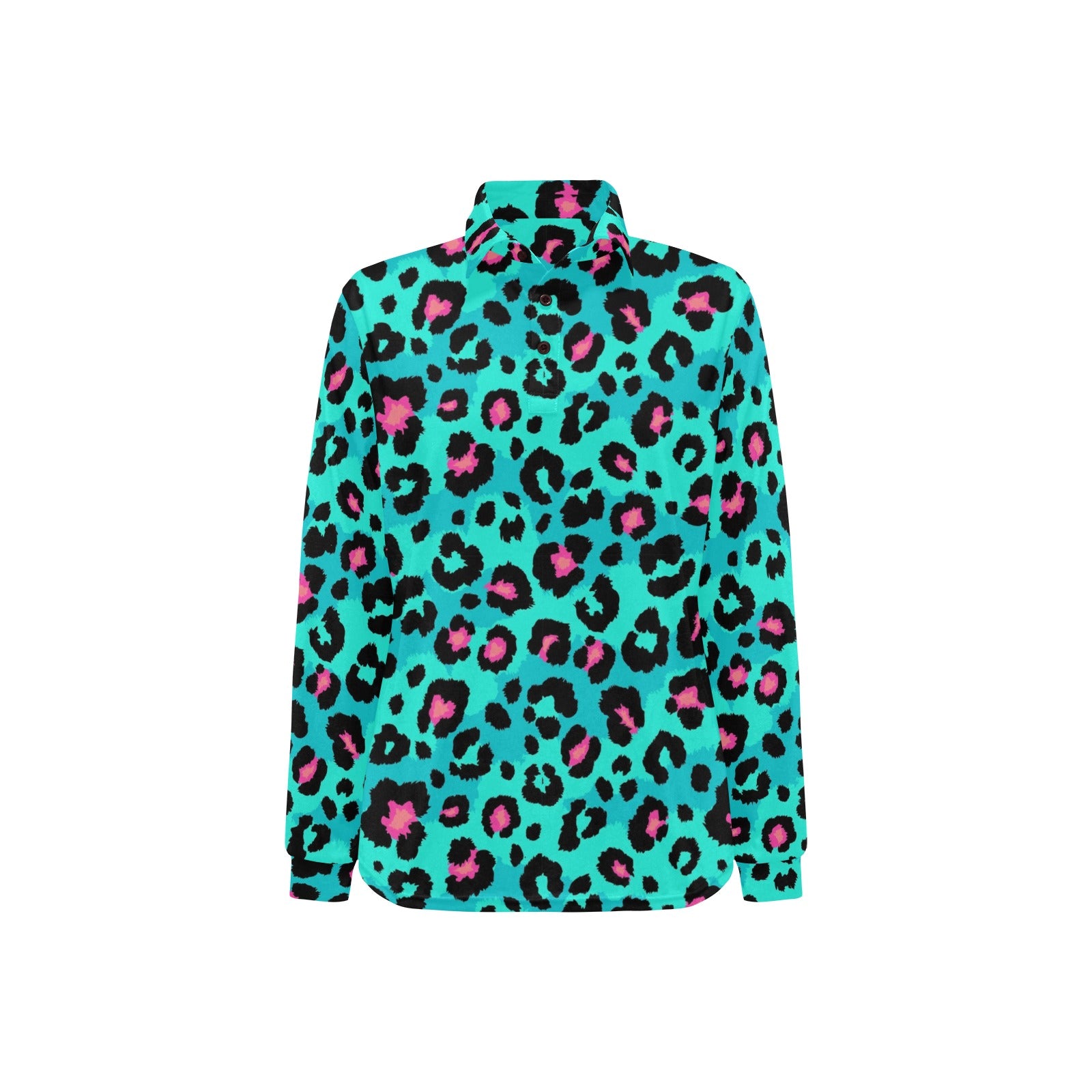 Green leopard skin print pattern Women's Long Sleeve Polo Shirt