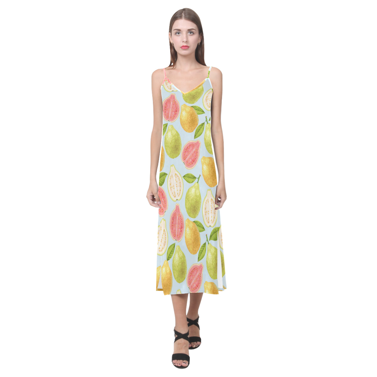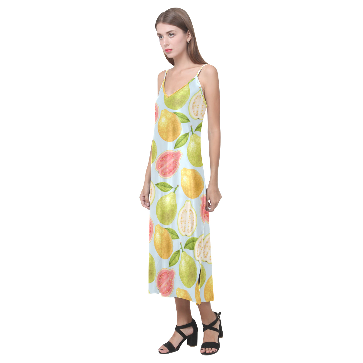 Guava design pattern V-Neck Open Fork Long Dress is a uniqued design and limited item. It made to order, hand printed, and sewn with love in our factory.