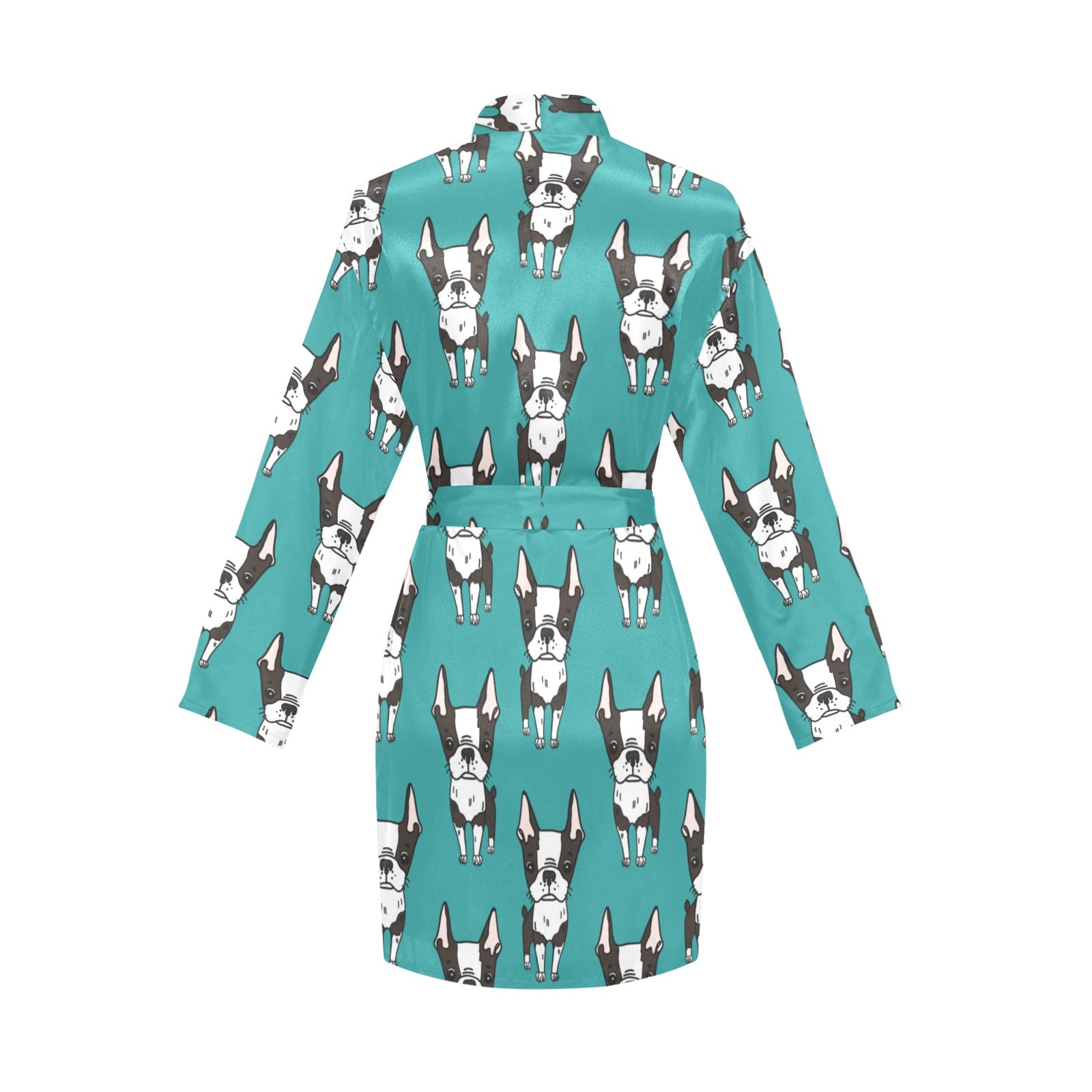 Hand drawn boston terrier dog pattern Women's Long Sleeve Belted Night Robe