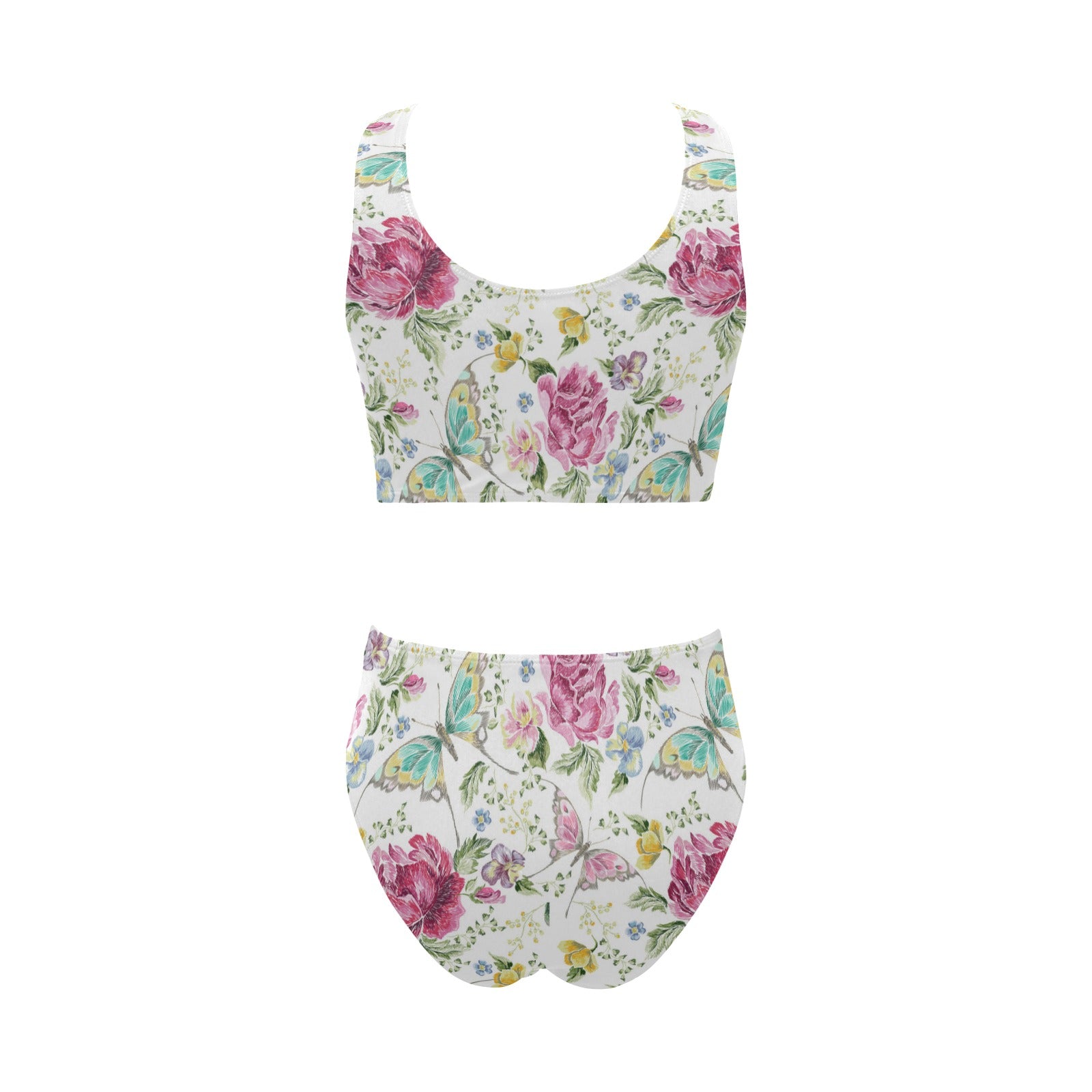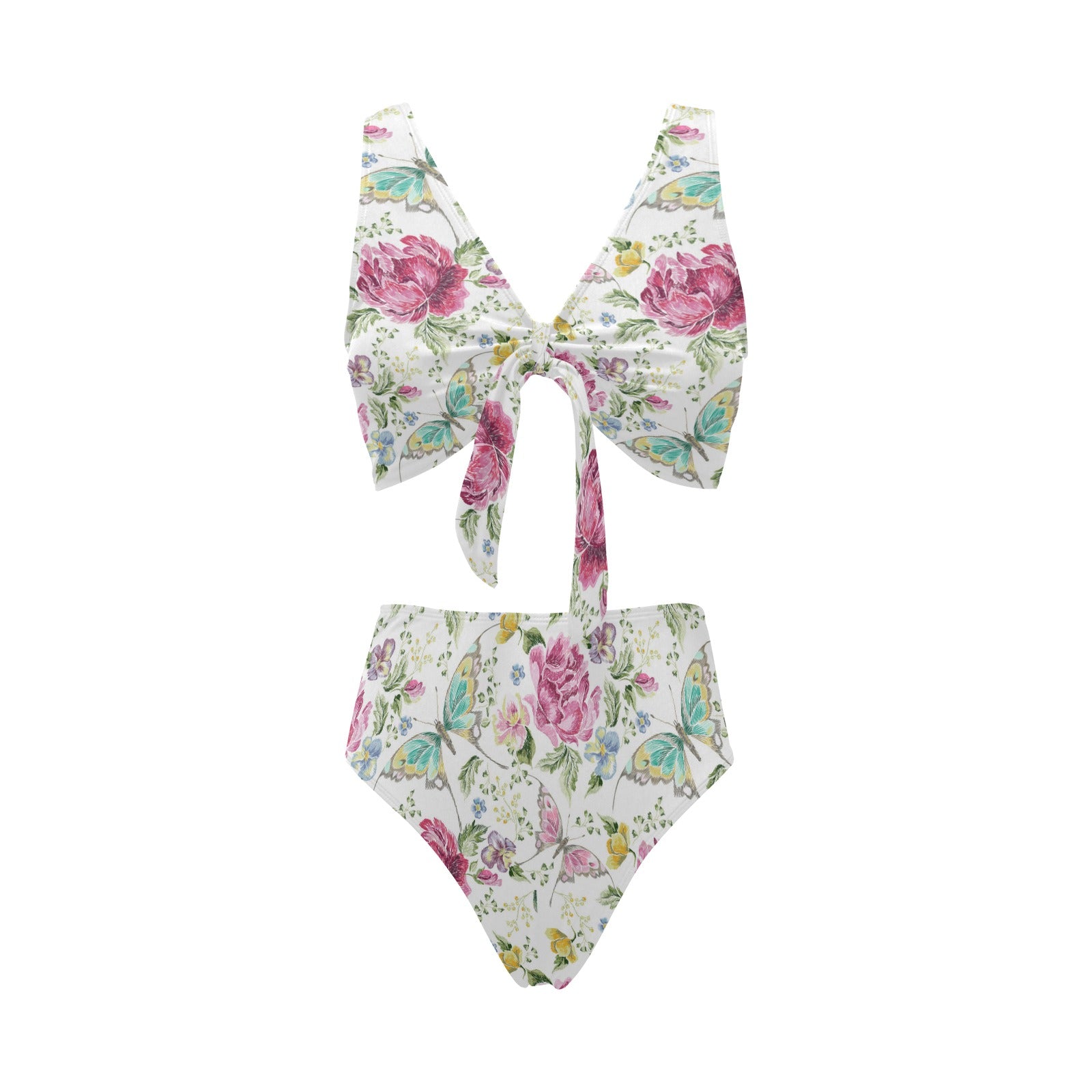 Hand drawn butterfly rose Chest Bowknot High Waisted Bikini Swimsuit