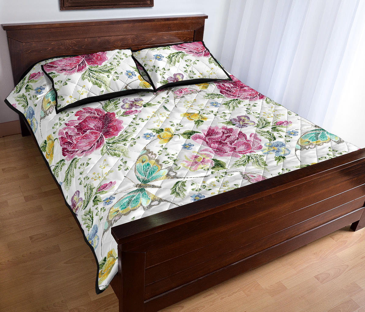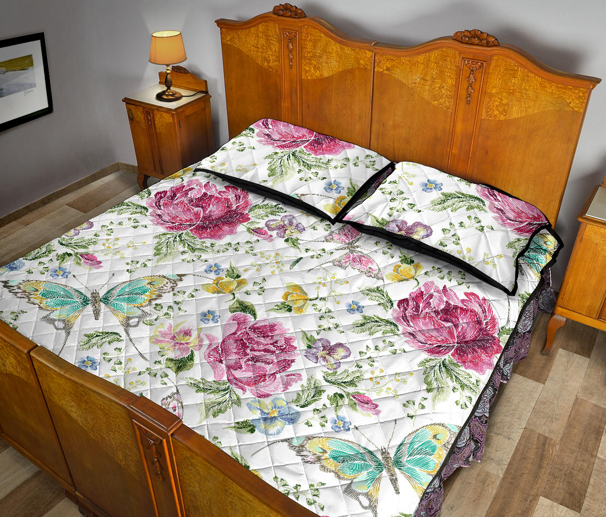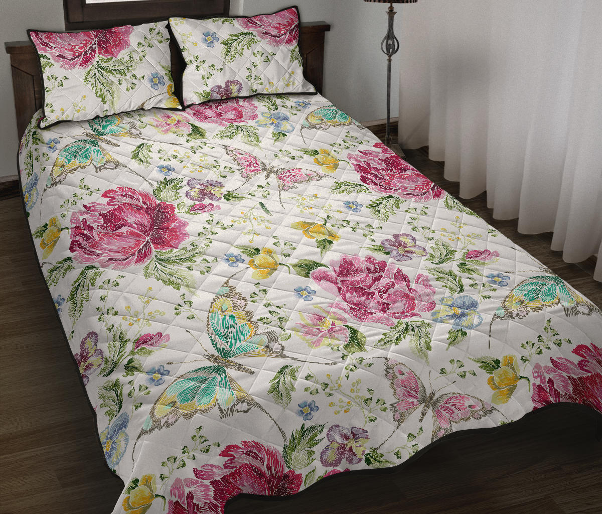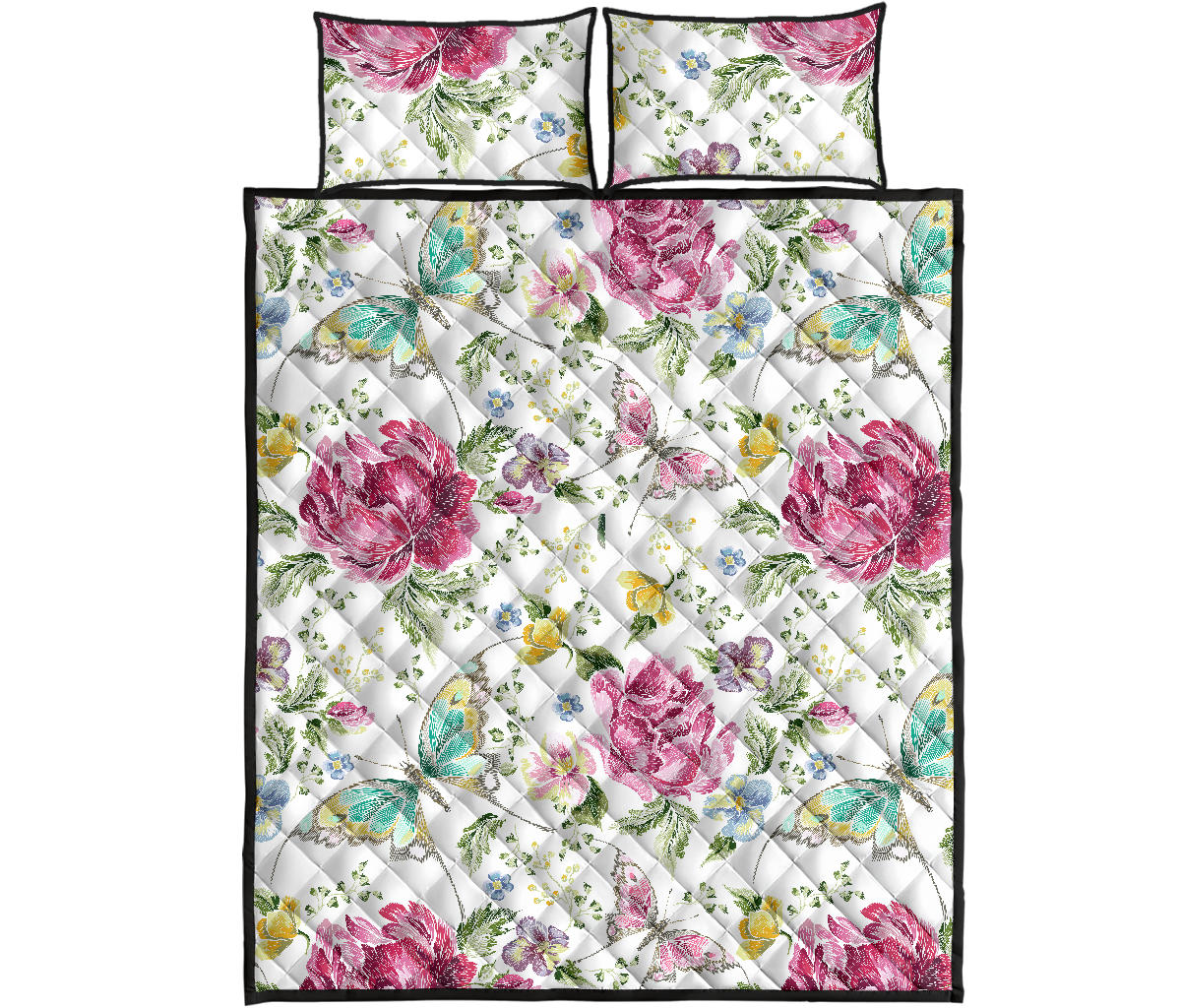 Hand drawn butterfly rose Quilt Bed Set