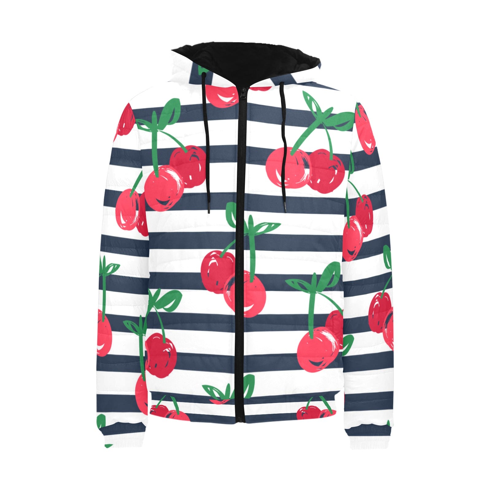 Hand drawn cherry pattern striped background Men's Padded Hooded Jacket