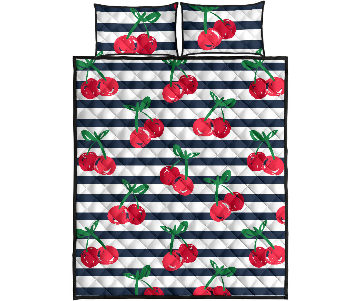 Hand drawn cherry pattern striped background Quilt Bed Set