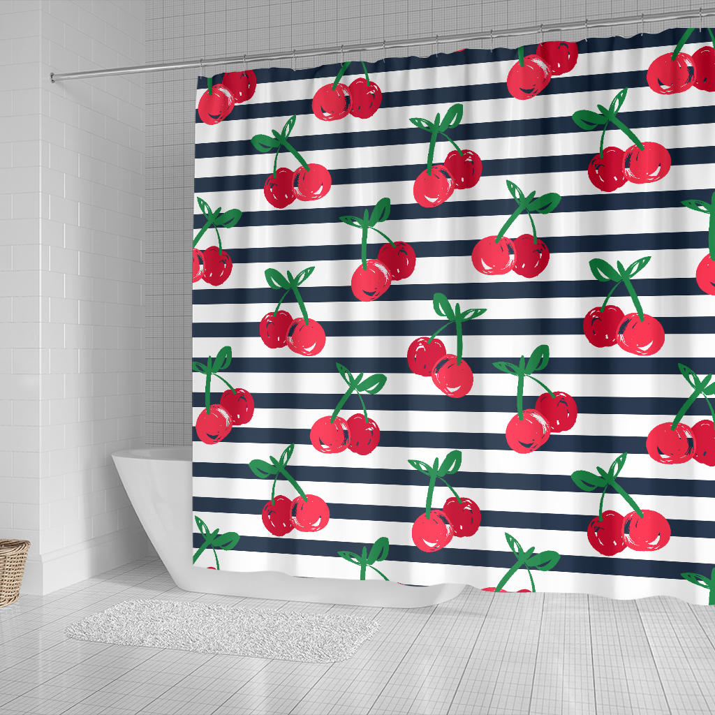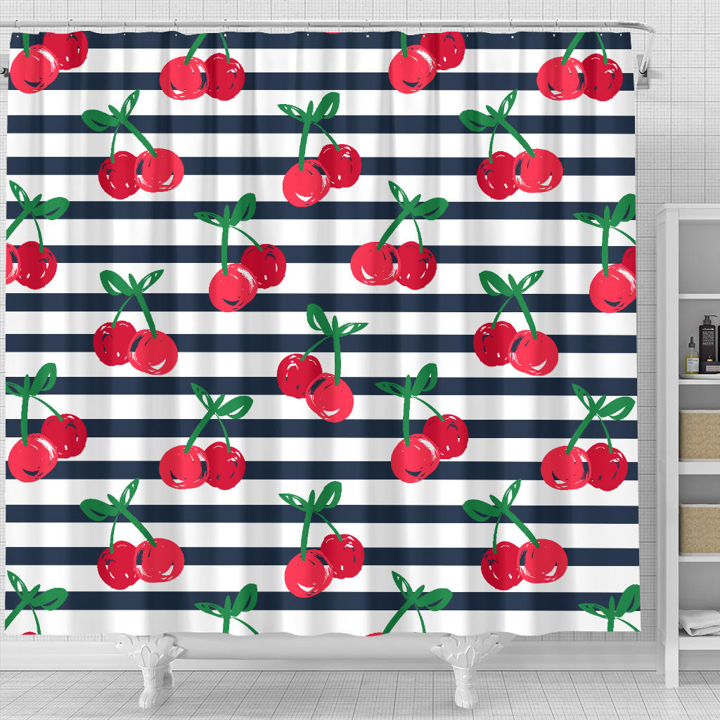 Hand Drawn Cherry Pattern Striped Background Shower Curtain Fulfilled In US