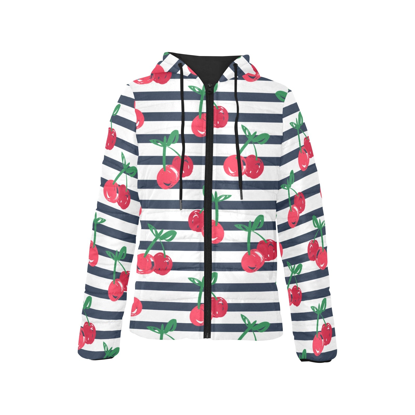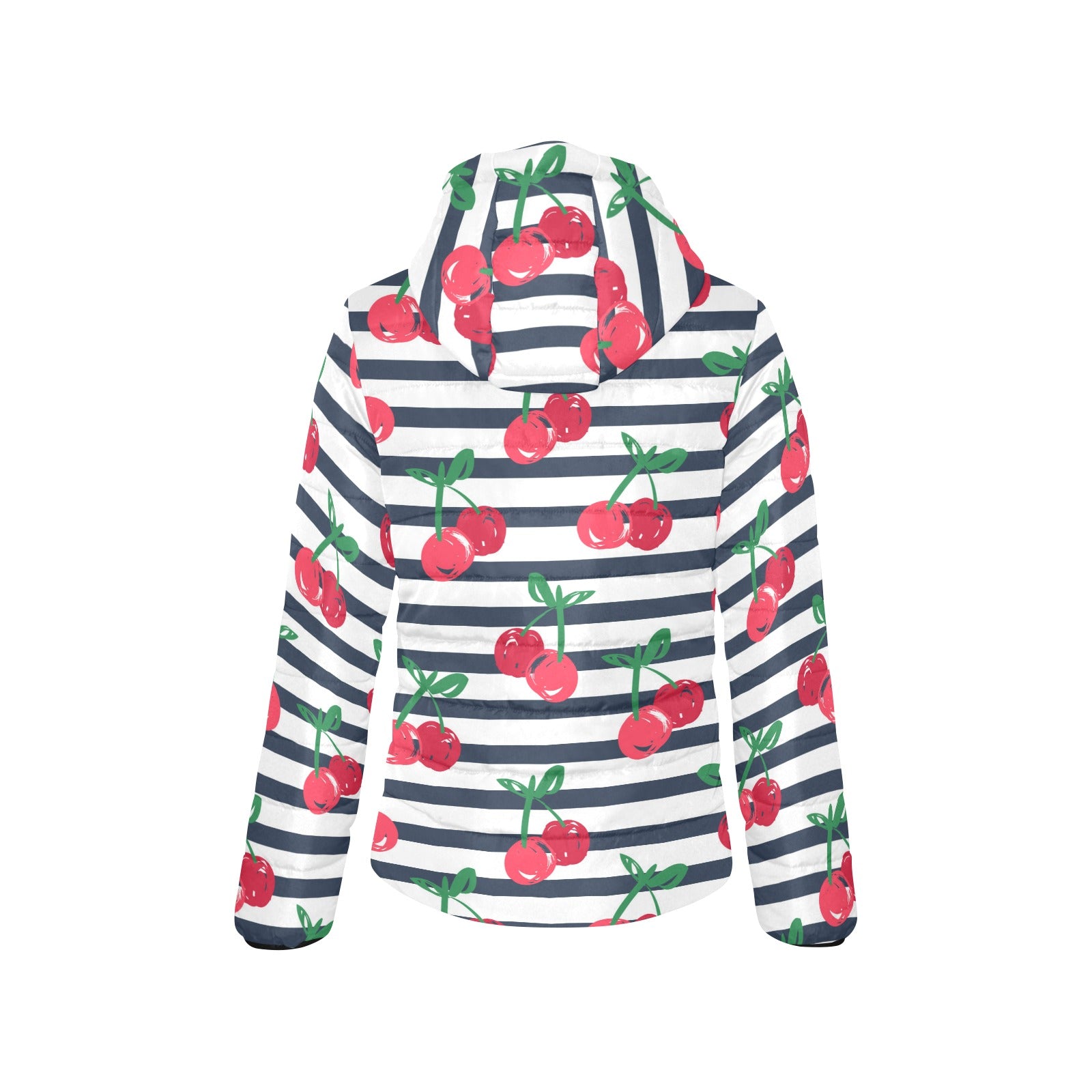 Hand drawn cherry pattern striped background Women's Padded Hooded Jacket