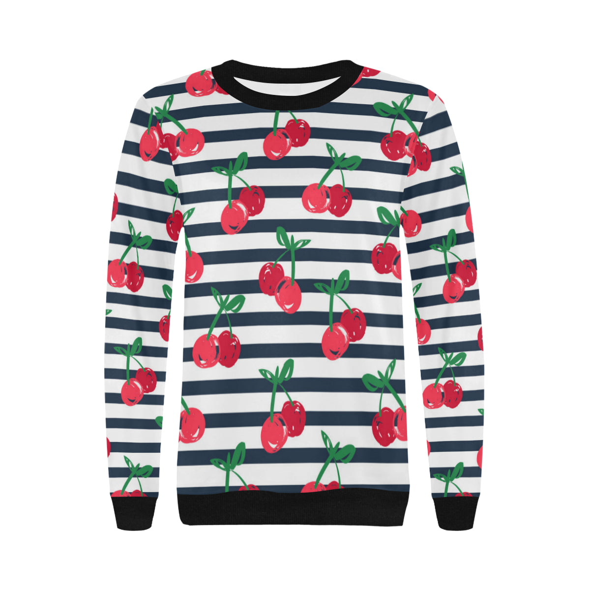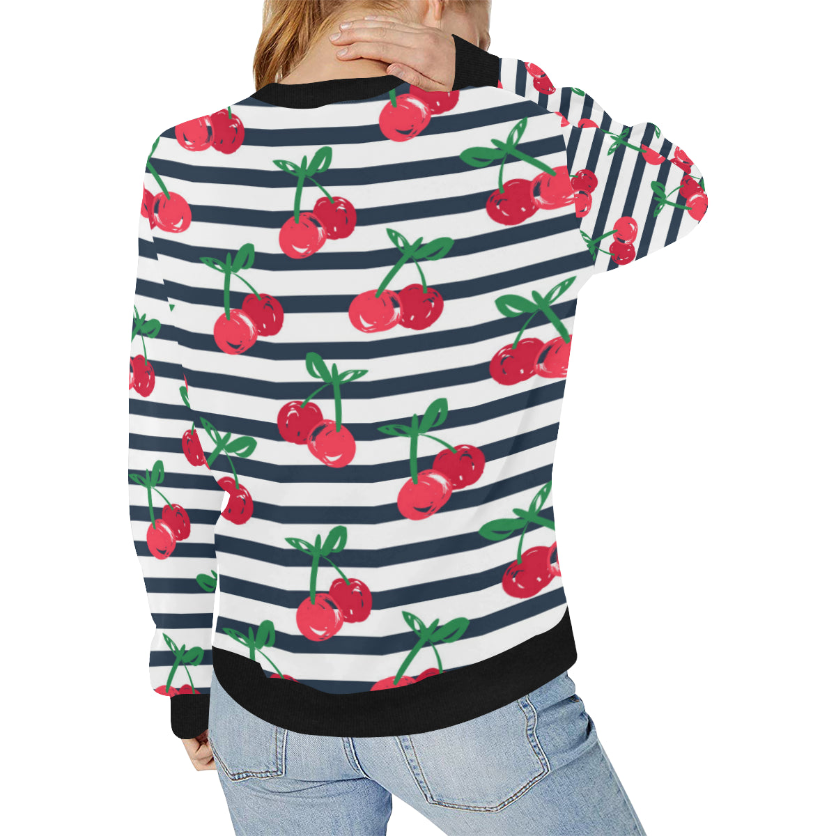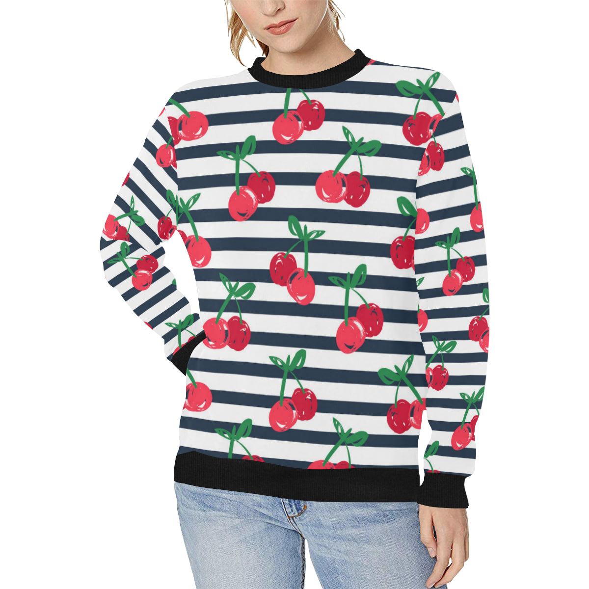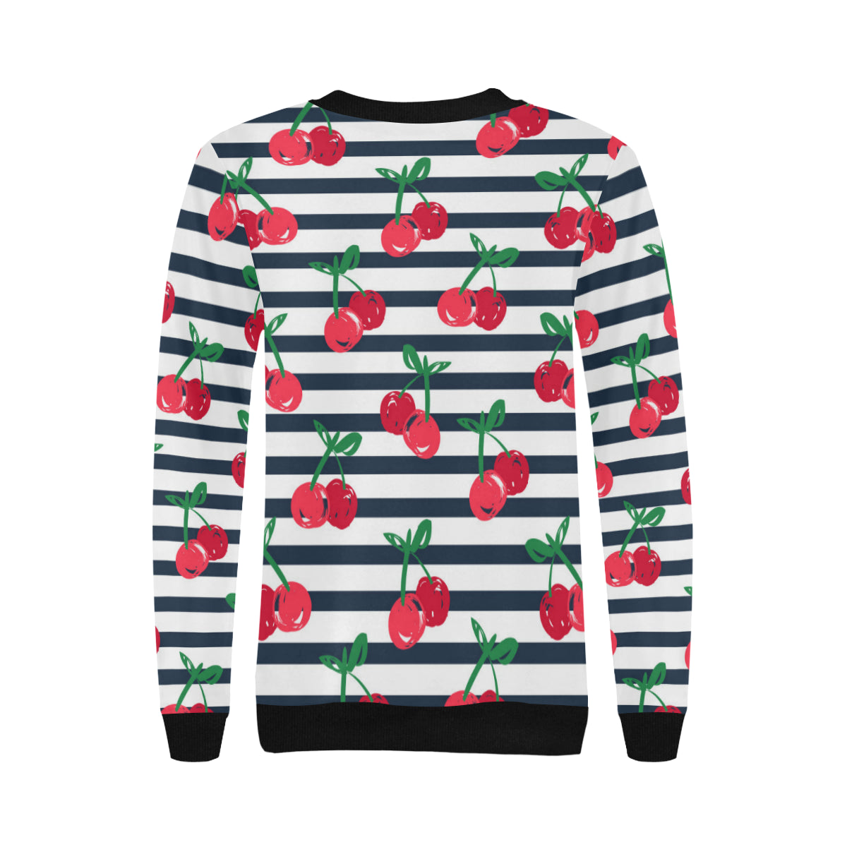 Hand drawn cherry pattern striped background Women's Crew Neck Sweatshirt