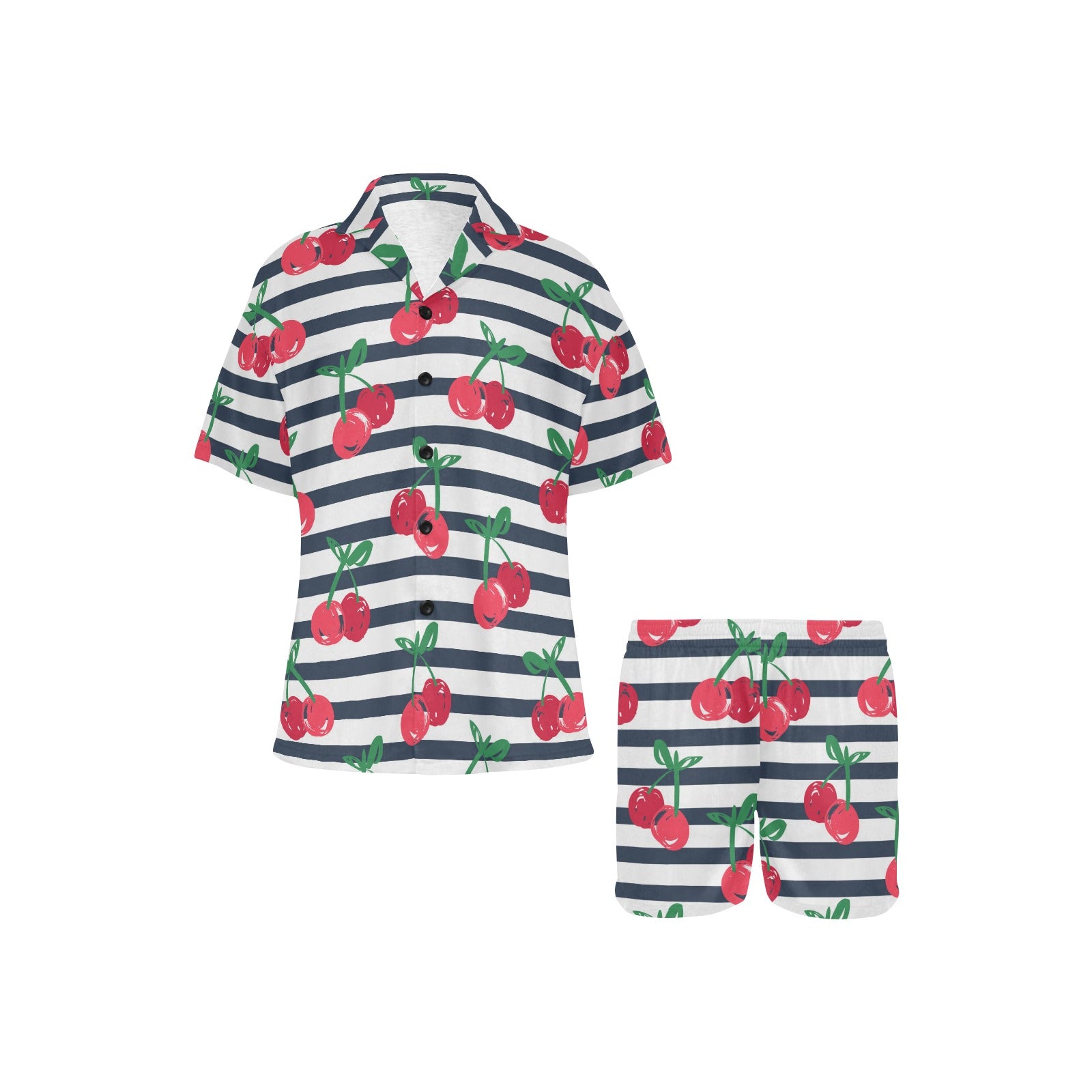 Hand drawn cherry pattern striped background Women's V-Neck Short Pajama Set