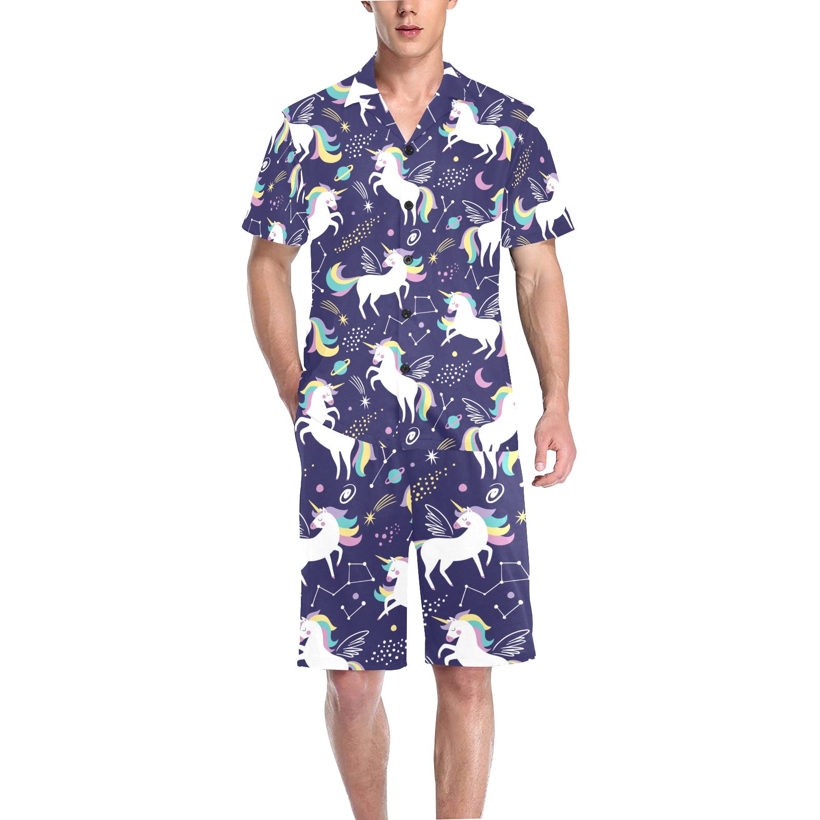 Hand drawn cute unicorn star planet Men's V-Neck Short Pajama Set