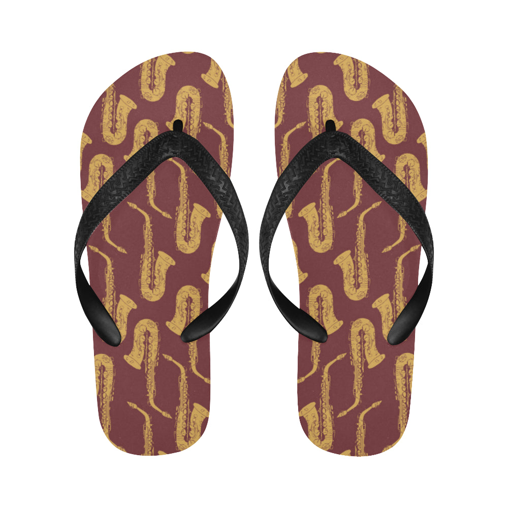 Hand drawn gold saxophone red background Unisex Flip Flops is a uniqued design and limited item. It made to order, hand printed, and sewn with love in our factory.