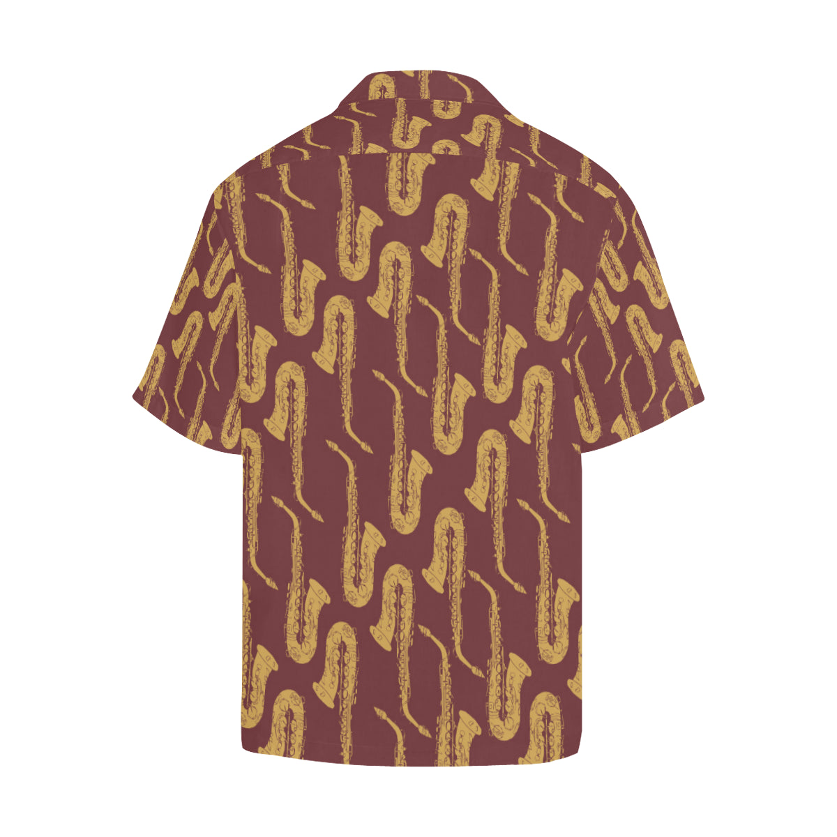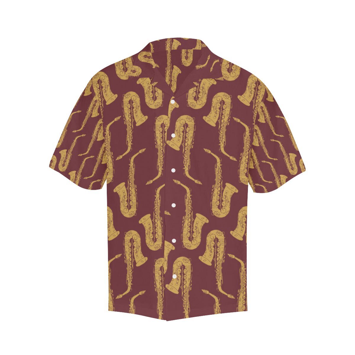 Hand drawn gold saxophone red background Men's All Over Print Hawaiian Shirt is a uniqued design and limited item. It made to order, hand printed, and sewn with love in our factory.