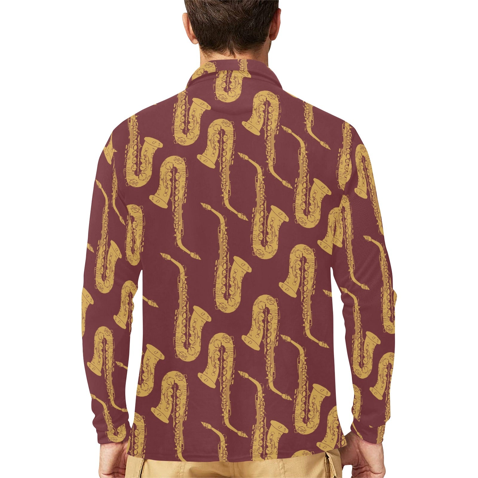 Hand drawn gold saxophone red background Men's Long Sleeve Polo Shirt
