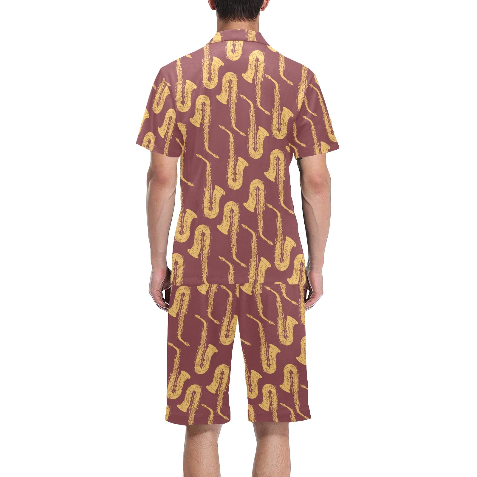 Hand drawn gold saxophone red background Men's V-Neck Short Pajama Set