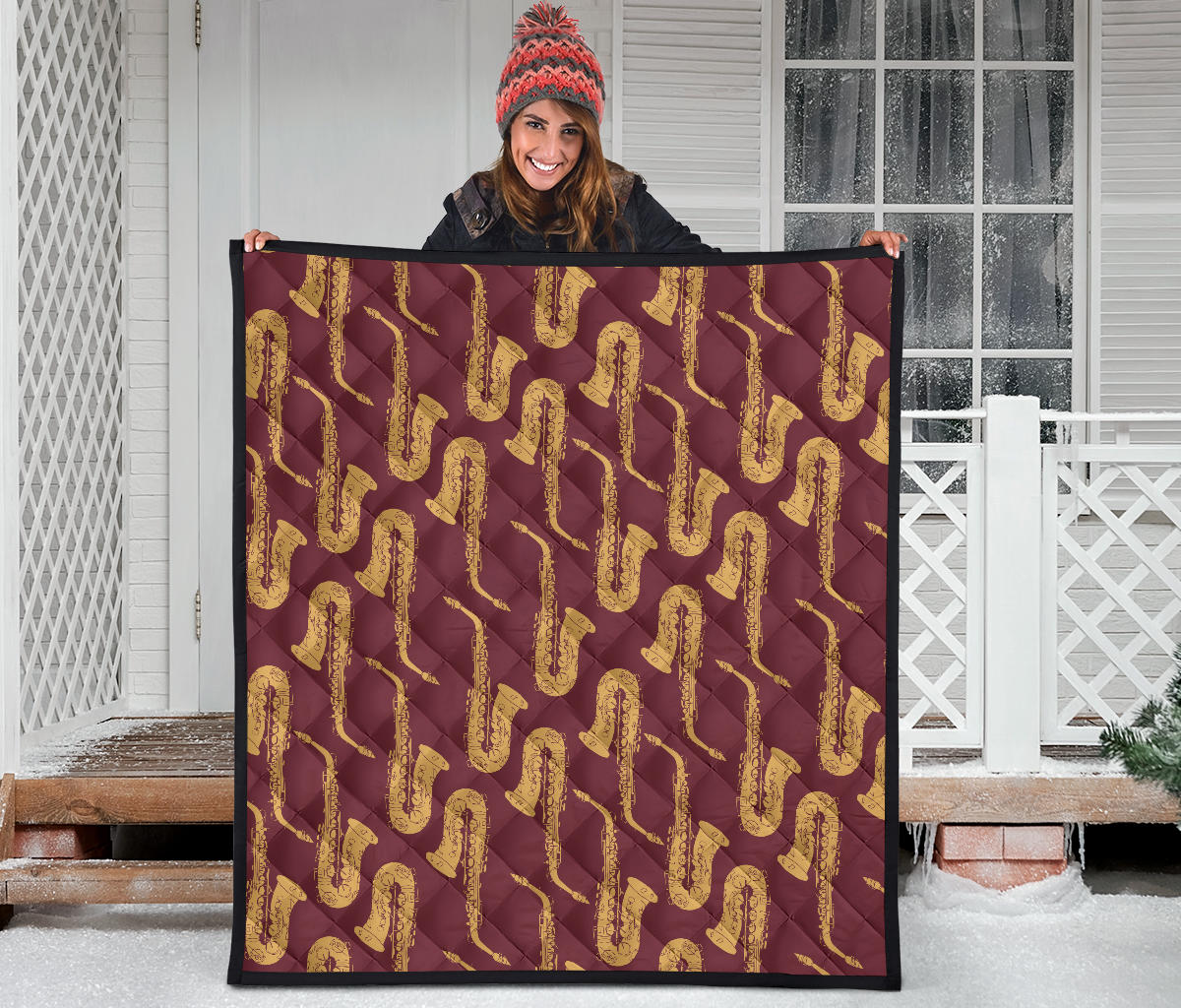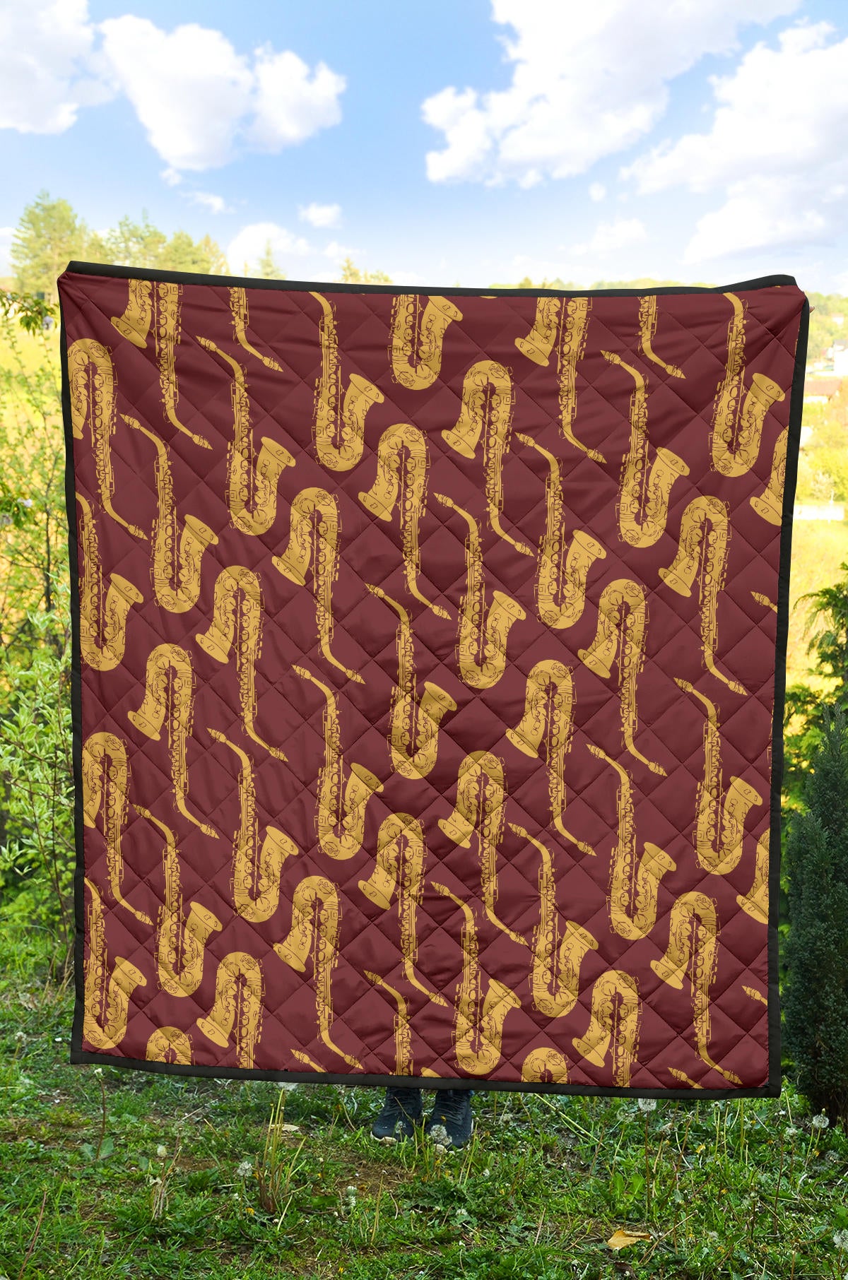 Hand Drawn Gold Saxophone Red Background Premium Quilt is a uniqued design and limited item. It made to order, hand printed, and sewn with love in our factory.