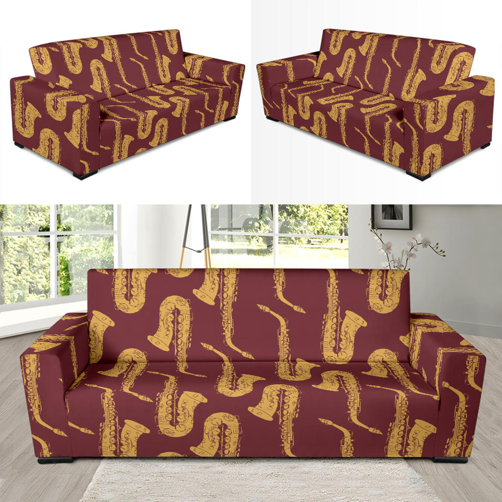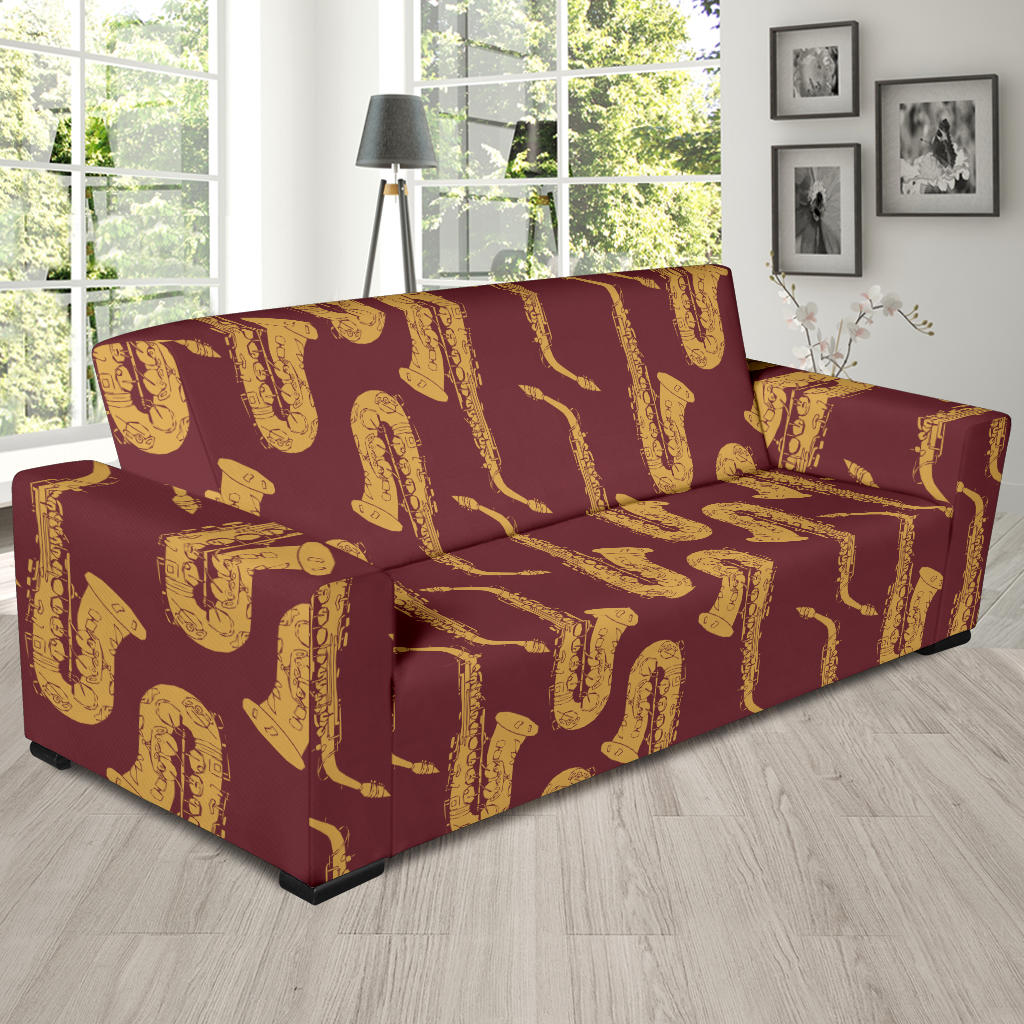 Hand drawn gold saxophone red background Sofa Slipcover is a uniqued design and limited item. It made to order, hand printed, and sewn with love in our factory.