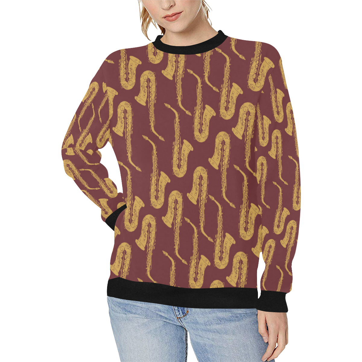 Hand drawn gold saxophone red background Women's Crew Neck Sweatshirt is a uniqued design and limited item. It made to order, hand printed, and sewn with love in our factory.