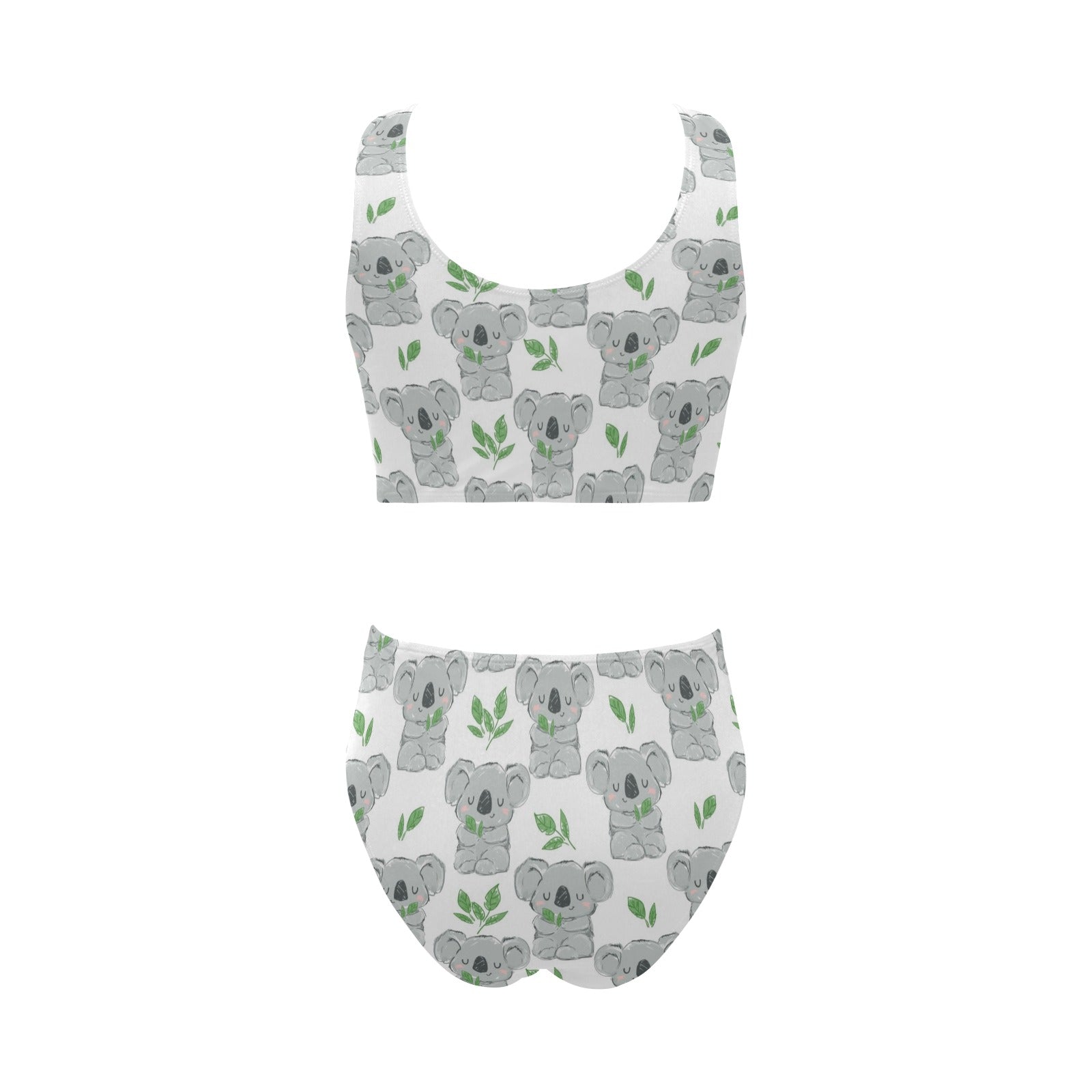 Hand drawn Koala leaves pattern Chest Bowknot High Waisted Bikini Swimsuit