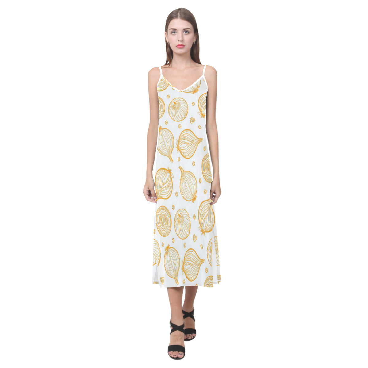 hand drawn onion pattern V-Neck Open Fork Long Dress