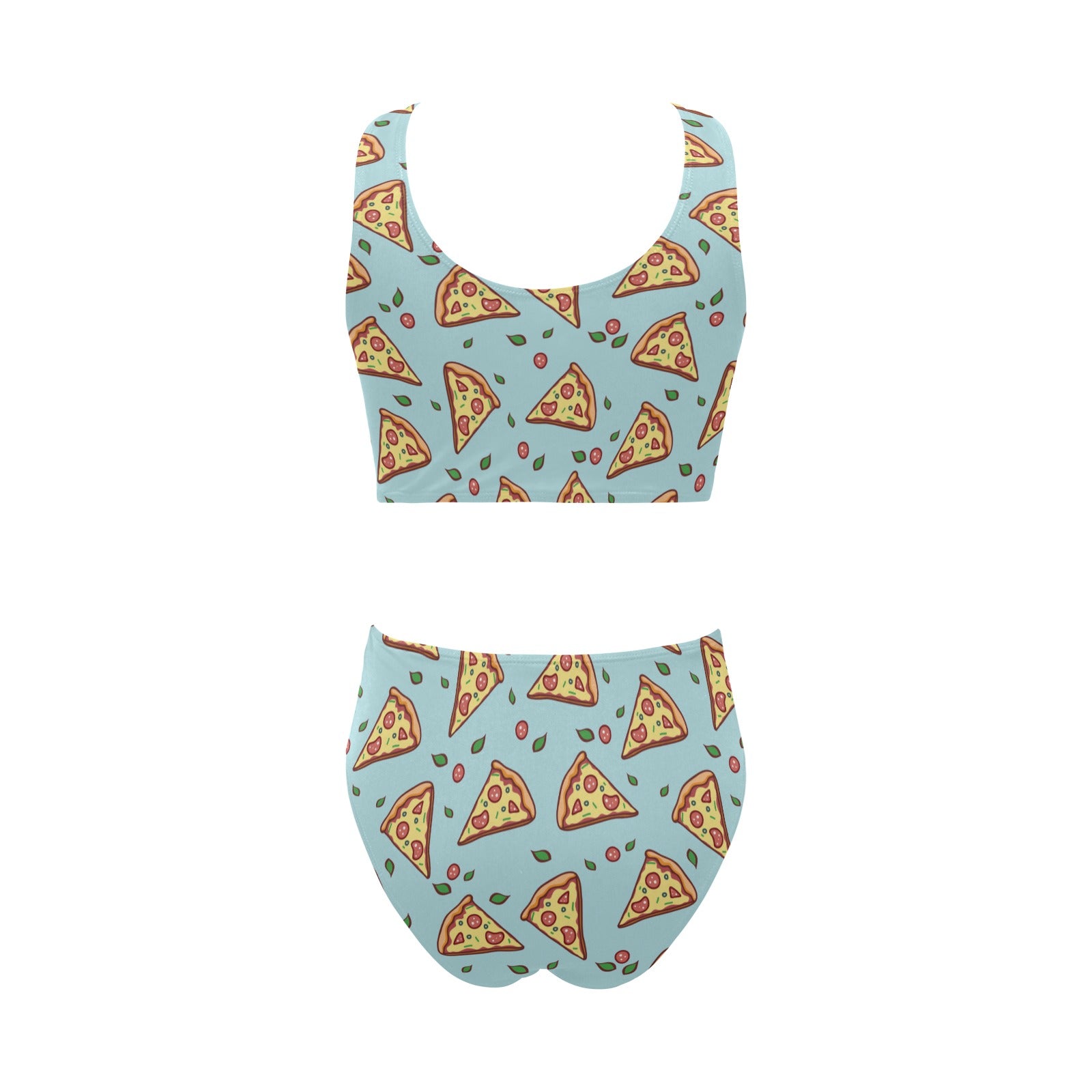 Hand drawn pizza blue background Chest Bowknot High Waisted Bikini Swimsuit