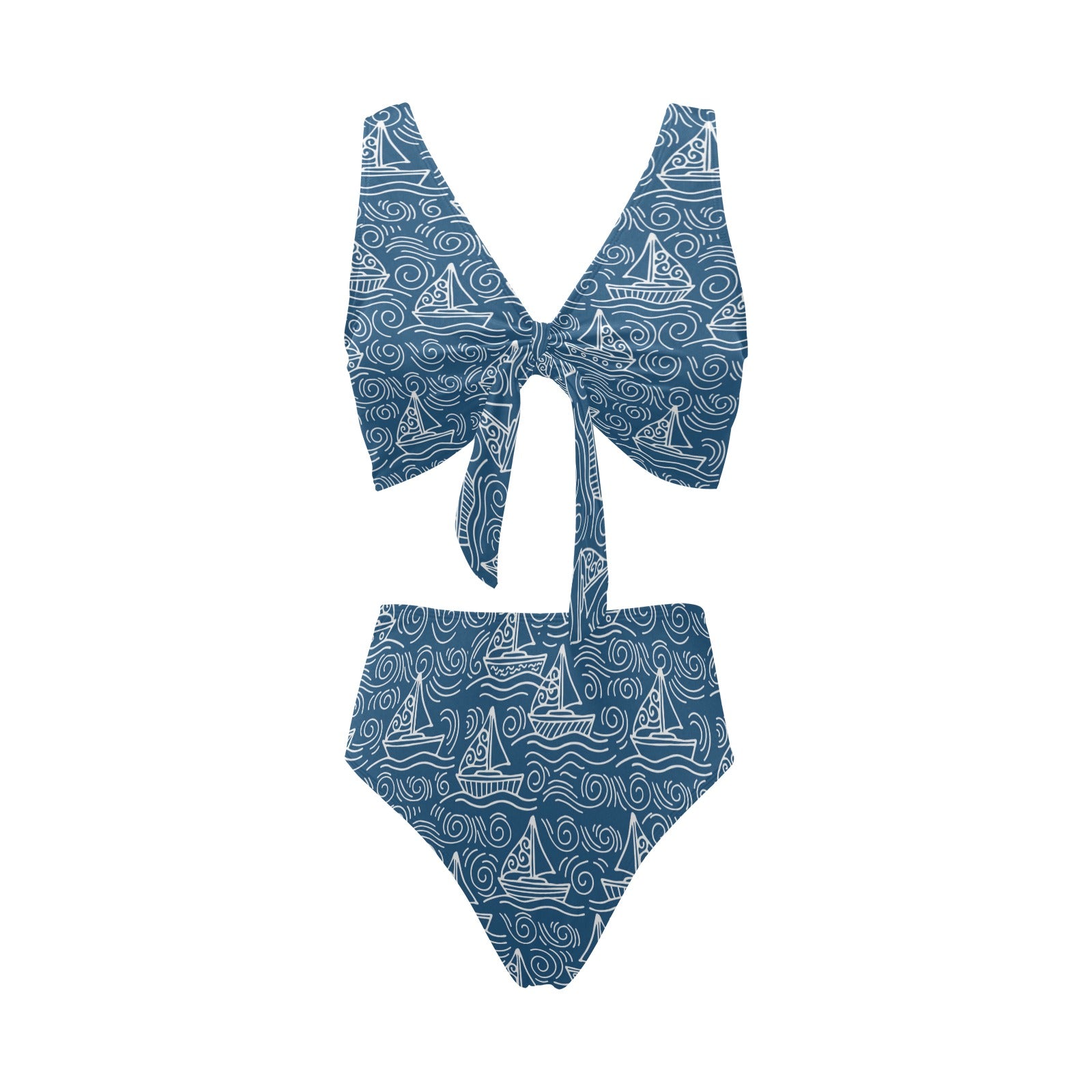 Hand drawn sailboat pattern Chest Bowknot High Waisted Bikini Swimsuit
