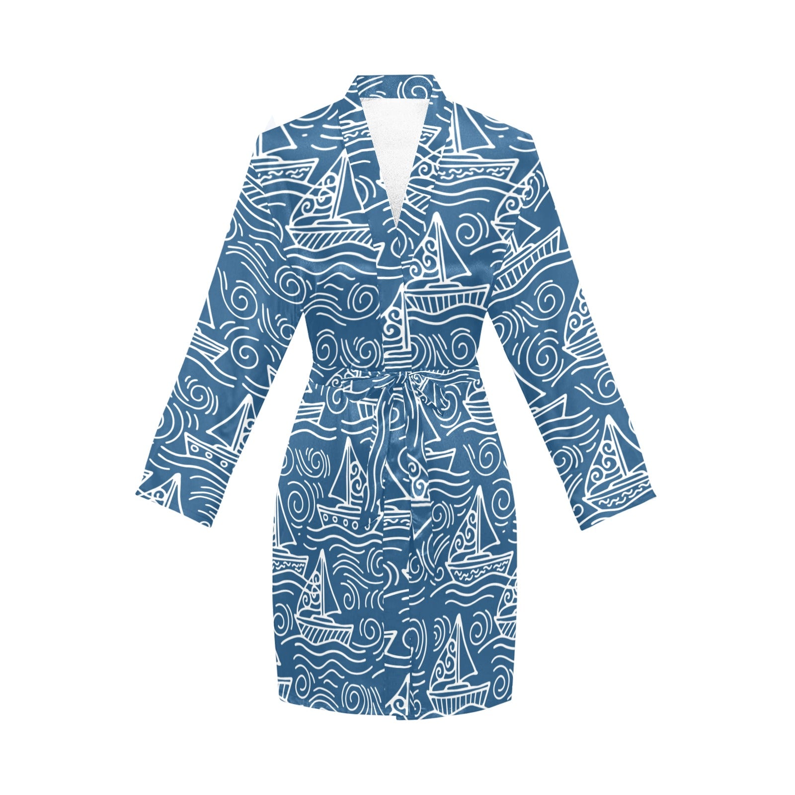 Hand drawn sailboat pattern Women's Long Sleeve Belted Night Robe
