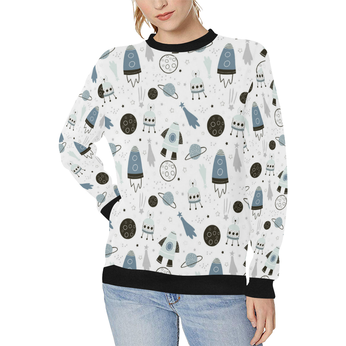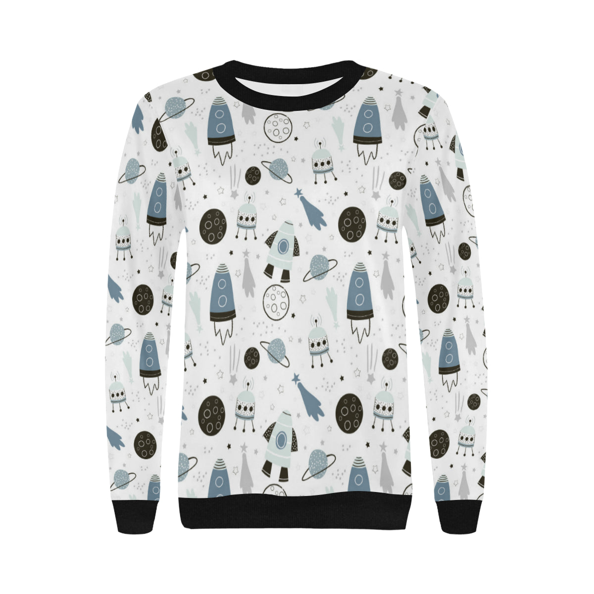 Hand drawn space elements space rocket star planet Women's Crew Neck Sweatshirt is a uniqued design and limited item. It made to order, hand printed, and sewn with love in our factory.