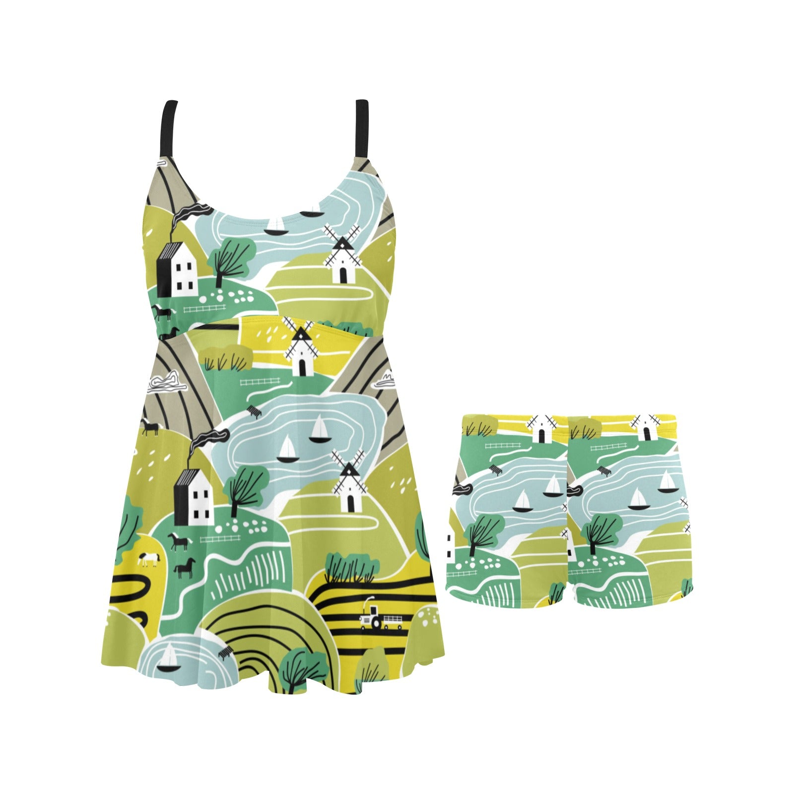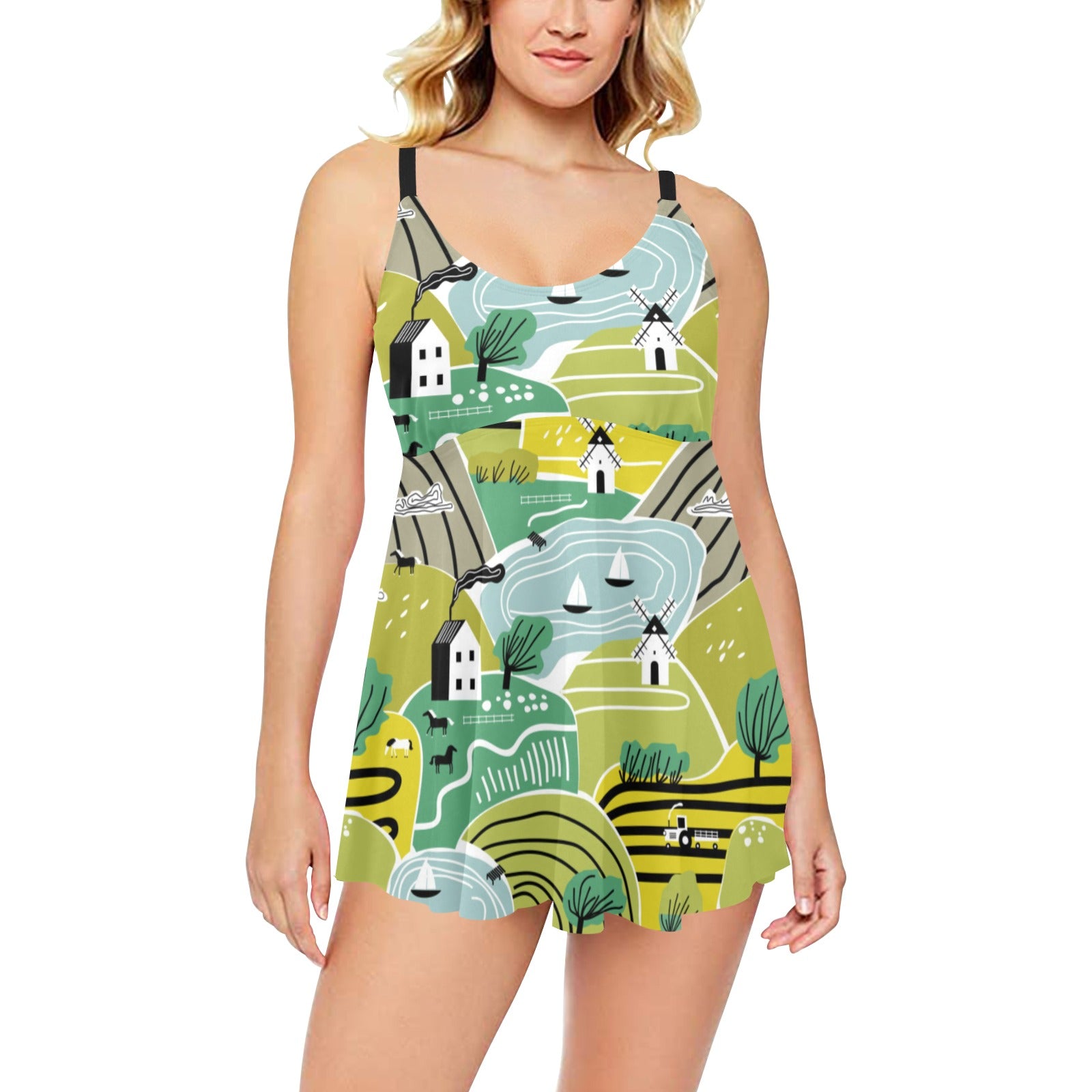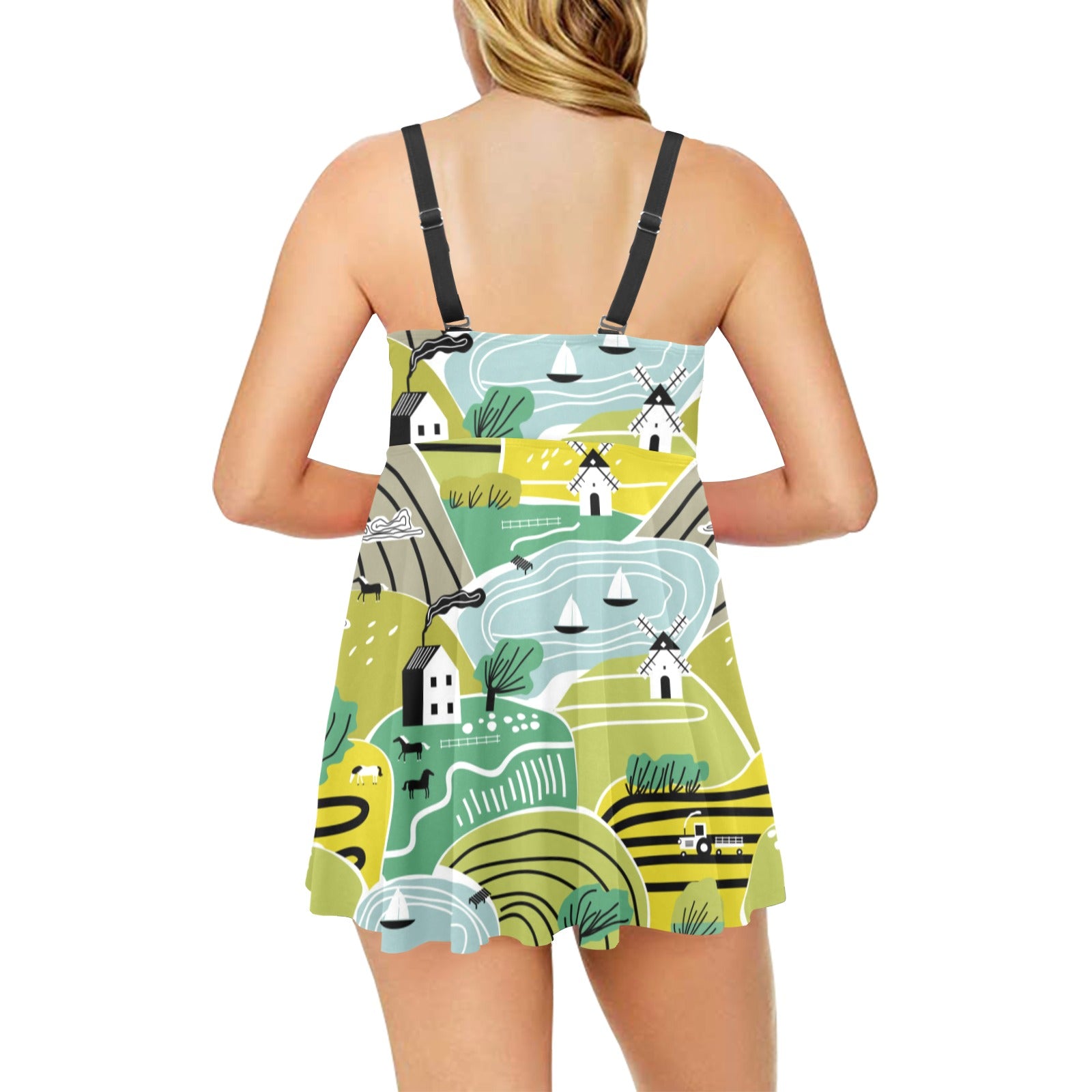 Hand drawn windmill pattern Chest Sexy Pleated Two Piece Swim Dress
