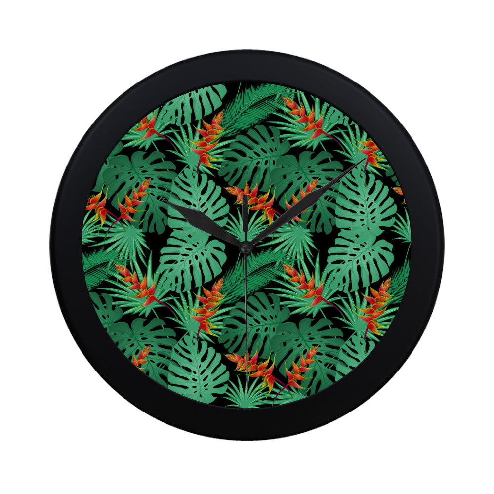 heliconia flower palm monstera leaves black backgr Elegant Black Wall Clock is a uniqued design and limited item. It made to order, hand printed, and sewn with love in our factory.