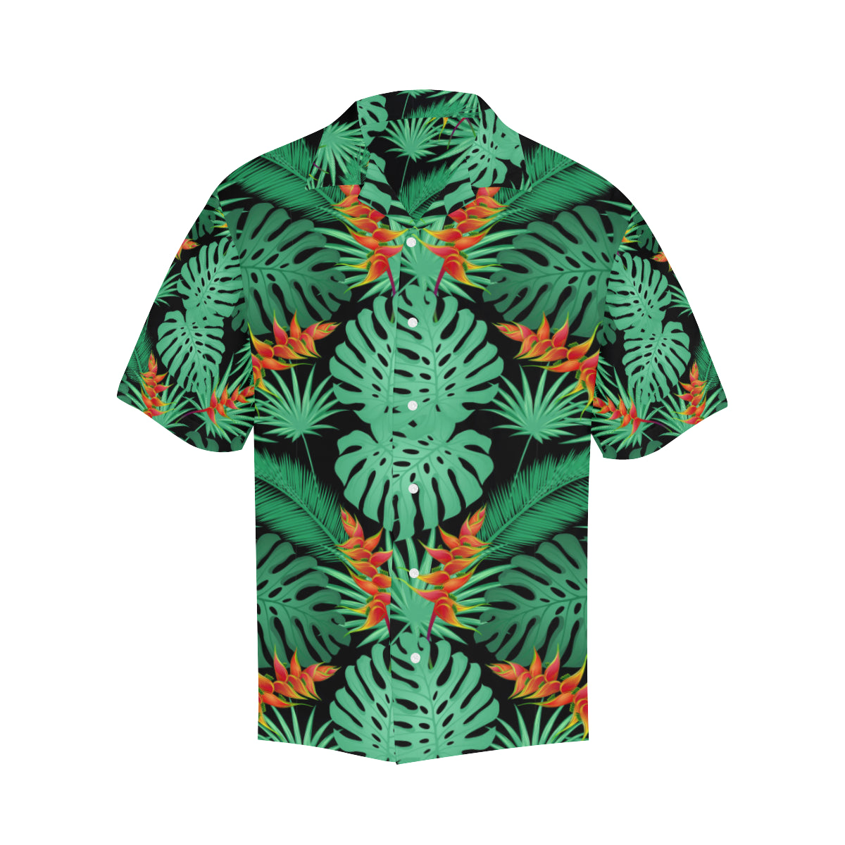 heliconia flower palm monstera leaves black backgr Men's All Over Print Hawaiian Shirt is a uniqued design and limited item. It made to order, hand printed, and sewn with love in our factory.