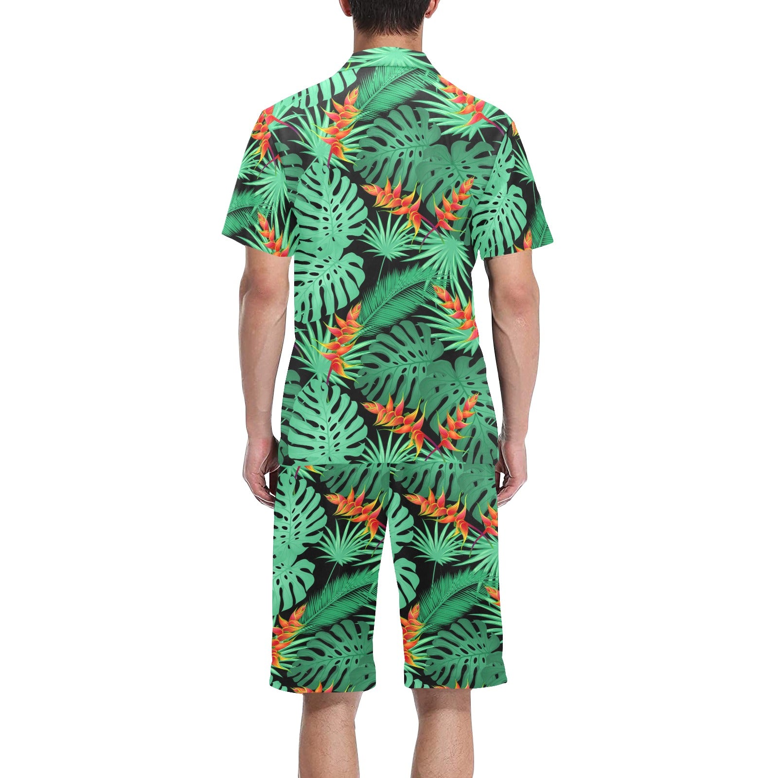heliconia flower palm monstera leaves black backgr Men's V-Neck Short Pajama Set