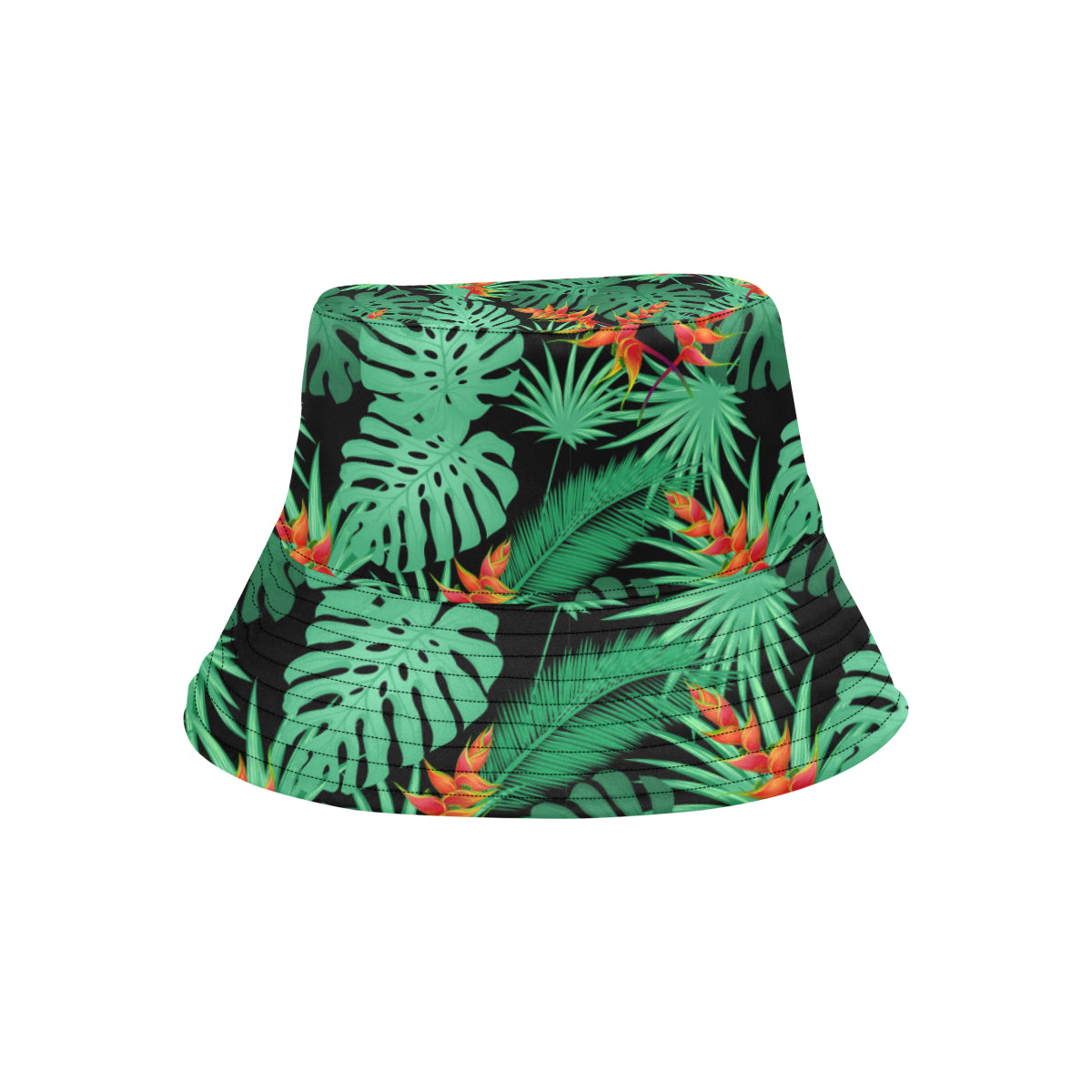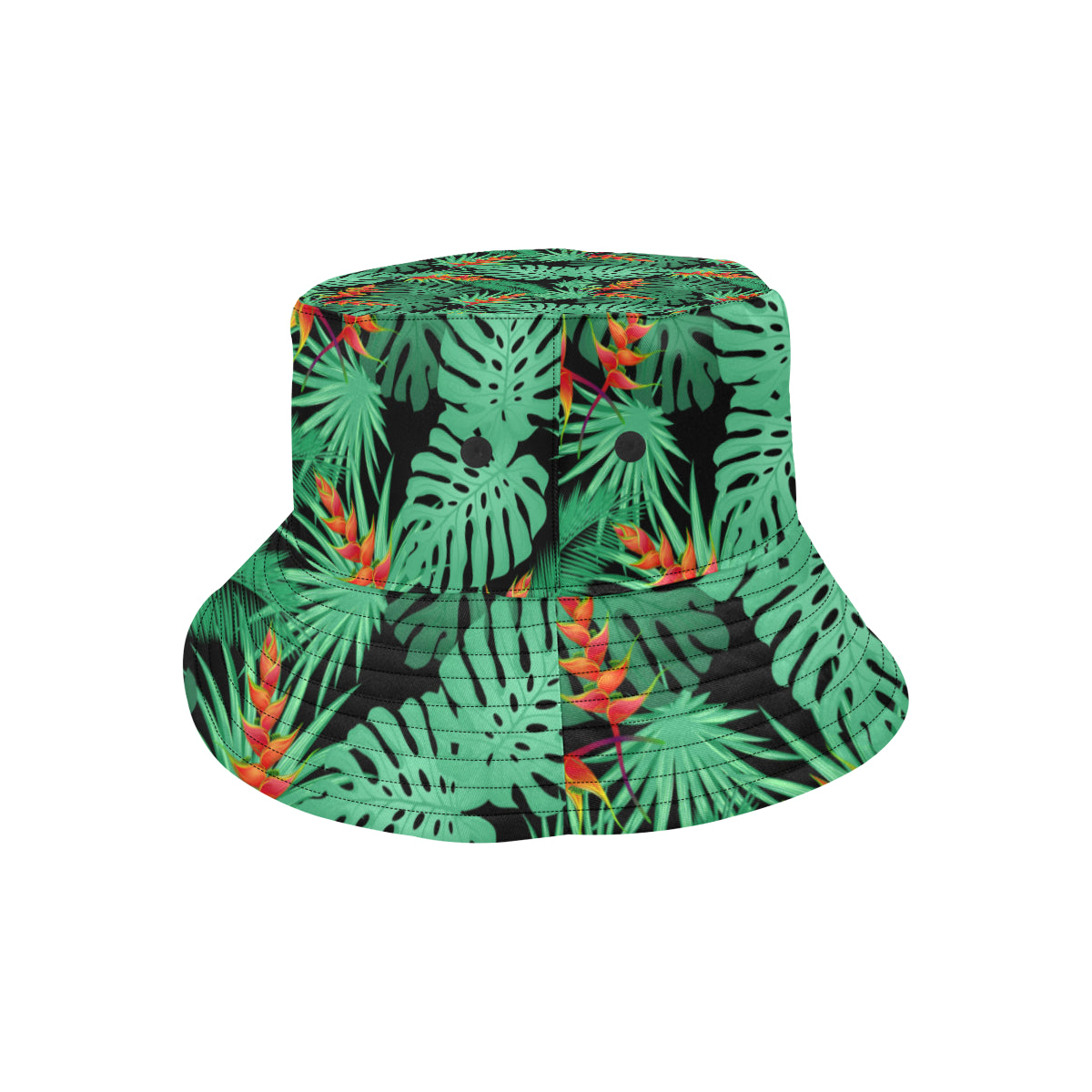 heliconia flower palm monstera leaves black backgr Unisex Bucket Hat is a uniqued design and limited item. It made to order, hand printed, and sewn with love in our factory.