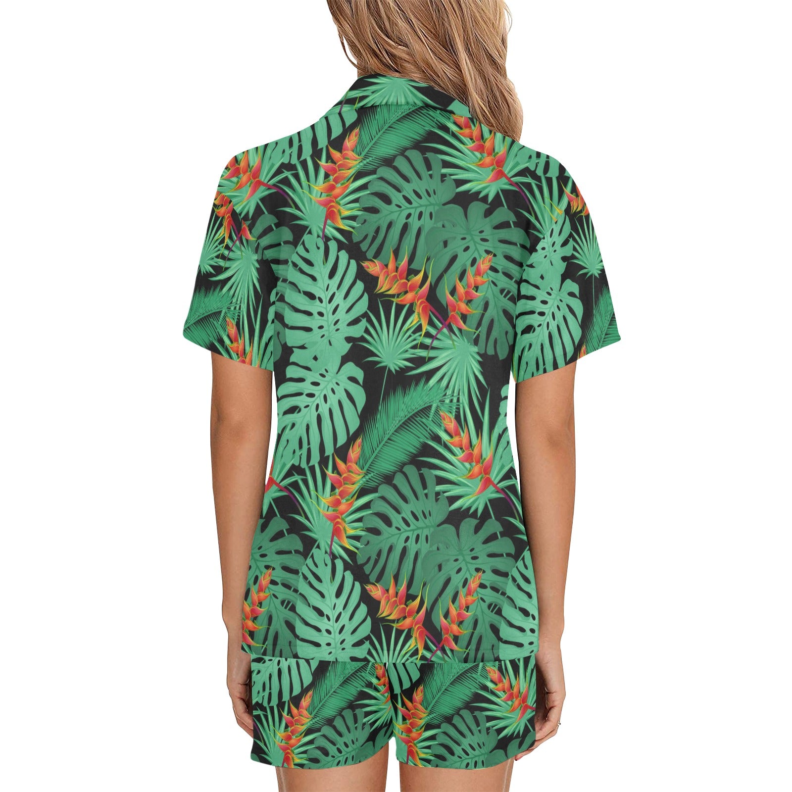 heliconia flower palm monstera leaves black backgr Women's V-Neck Short Pajama Set
