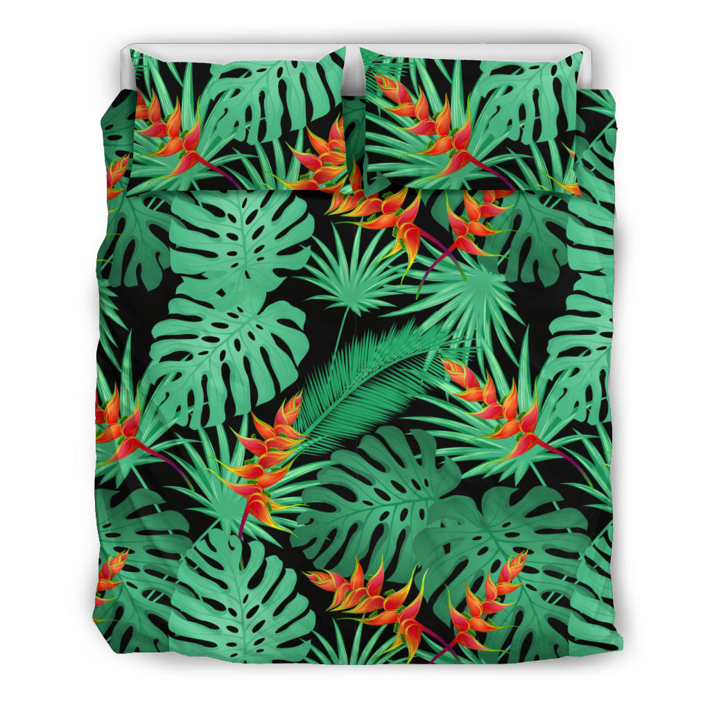 heliconia flower palm monstera leaves black background Bedding Set is a uniqued design and limited item. It made to order, hand printed, and sewn with love in our factory.