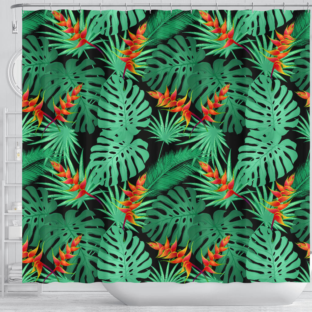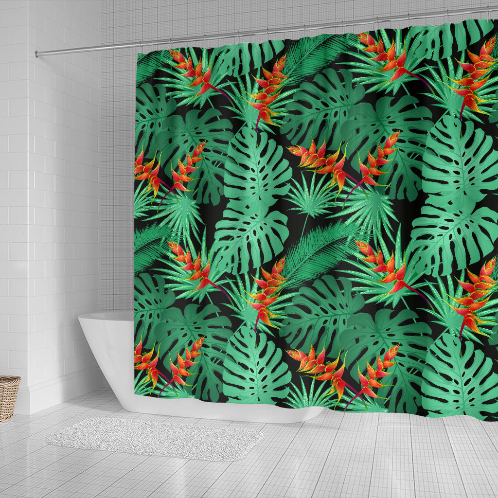 Heliconia Flower Palm Monstera Leaves Black Background Shower Curtain Fulfilled In US