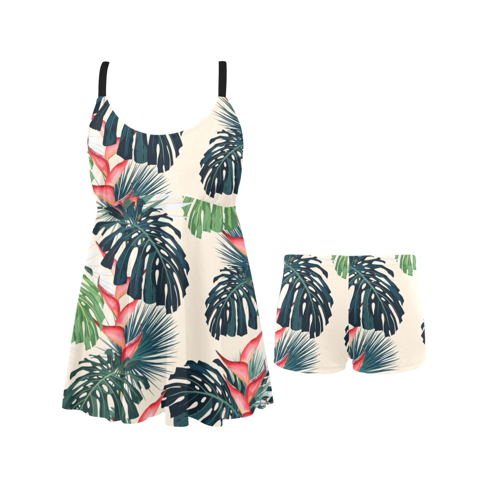 heliconia flowers, palm and monstera leaves Chest Sexy Pleated Two Piece Swim Dress