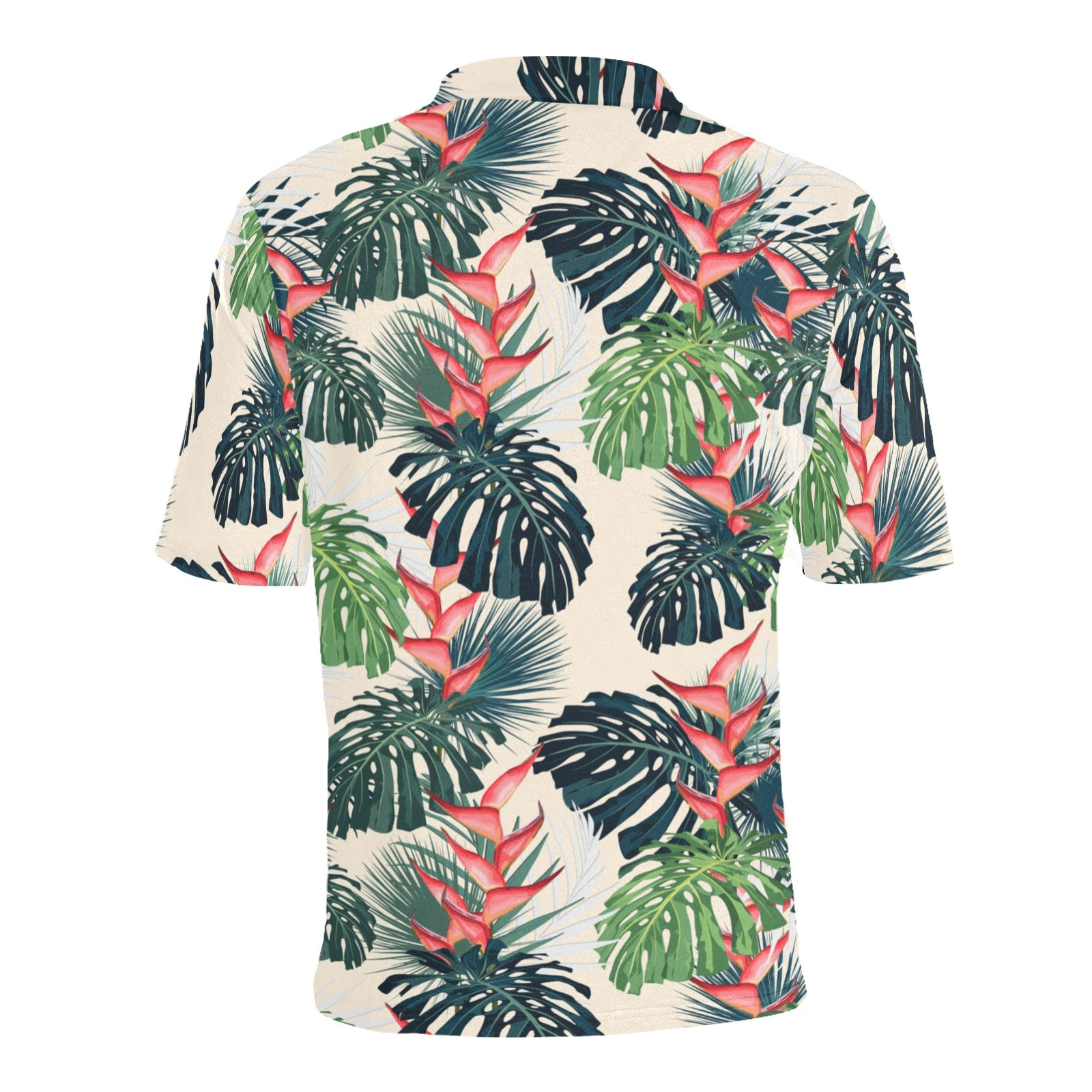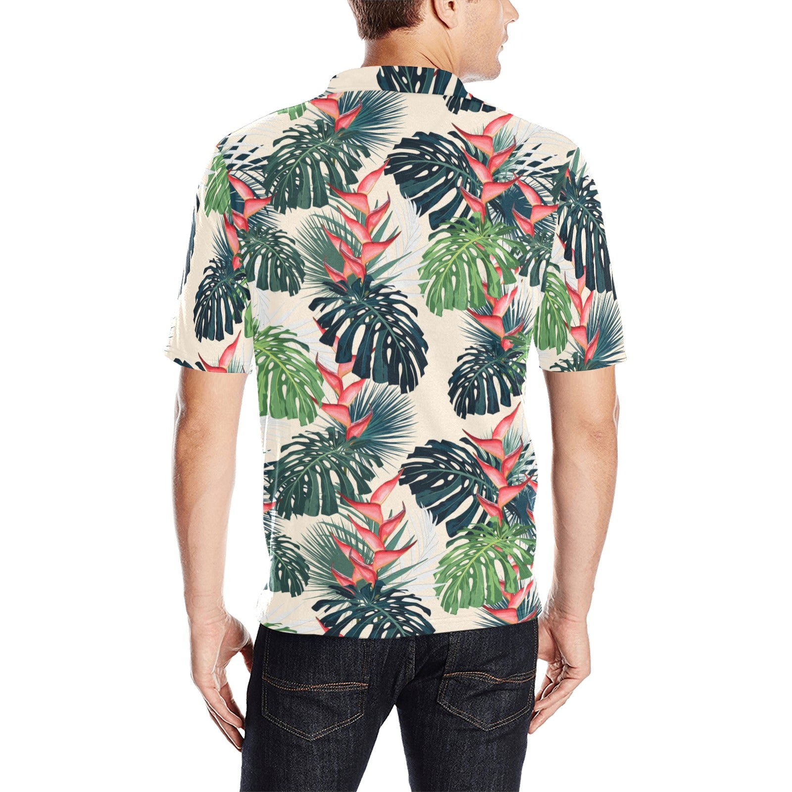 heliconia flowers, palm and monstera leaves Men's All Over Print Polo Shirt