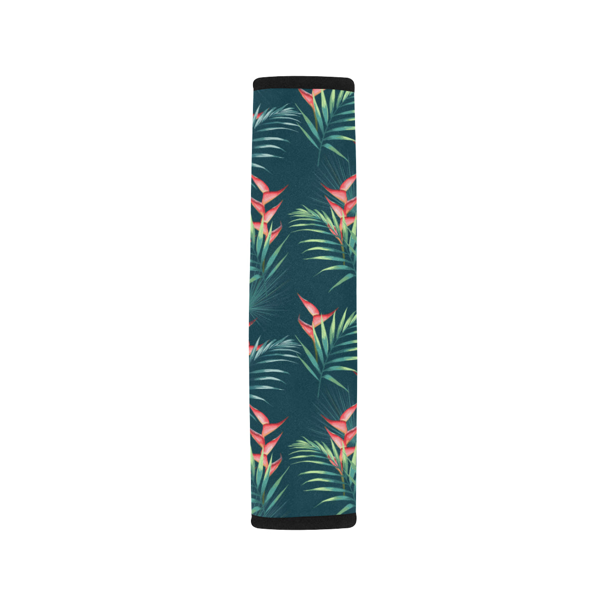 heliconia flowers, palm and monstera leaves on bla Car Seat Belt Cover is a uniqued design and limited item. It made to order, hand printed, and sewn with love in our factory.
