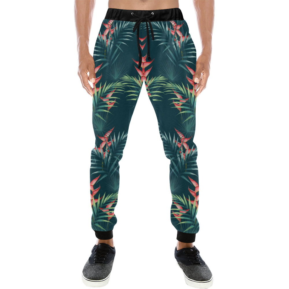 heliconia flowers, palm and monstera leaves on bla Unisex Casual Sweatpants