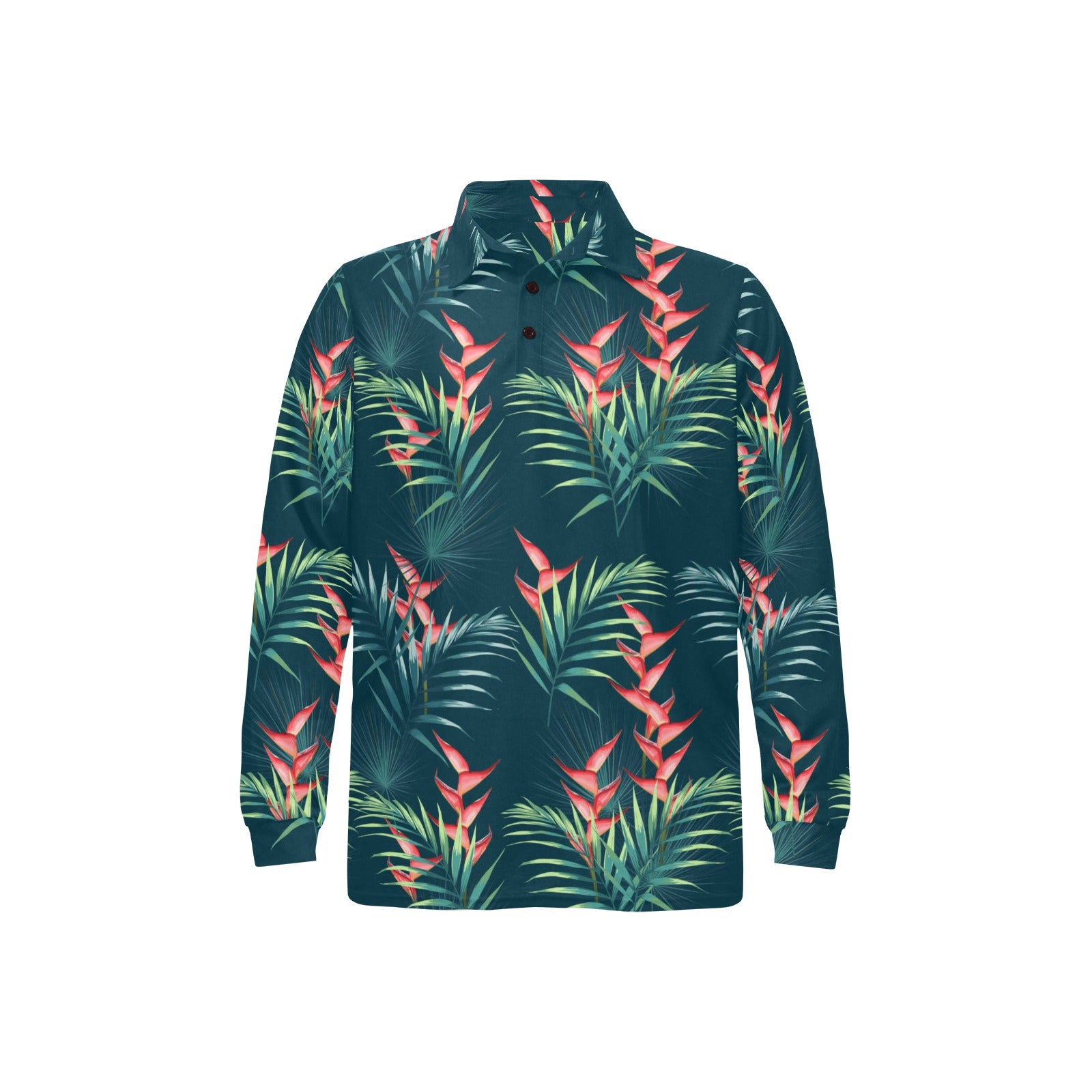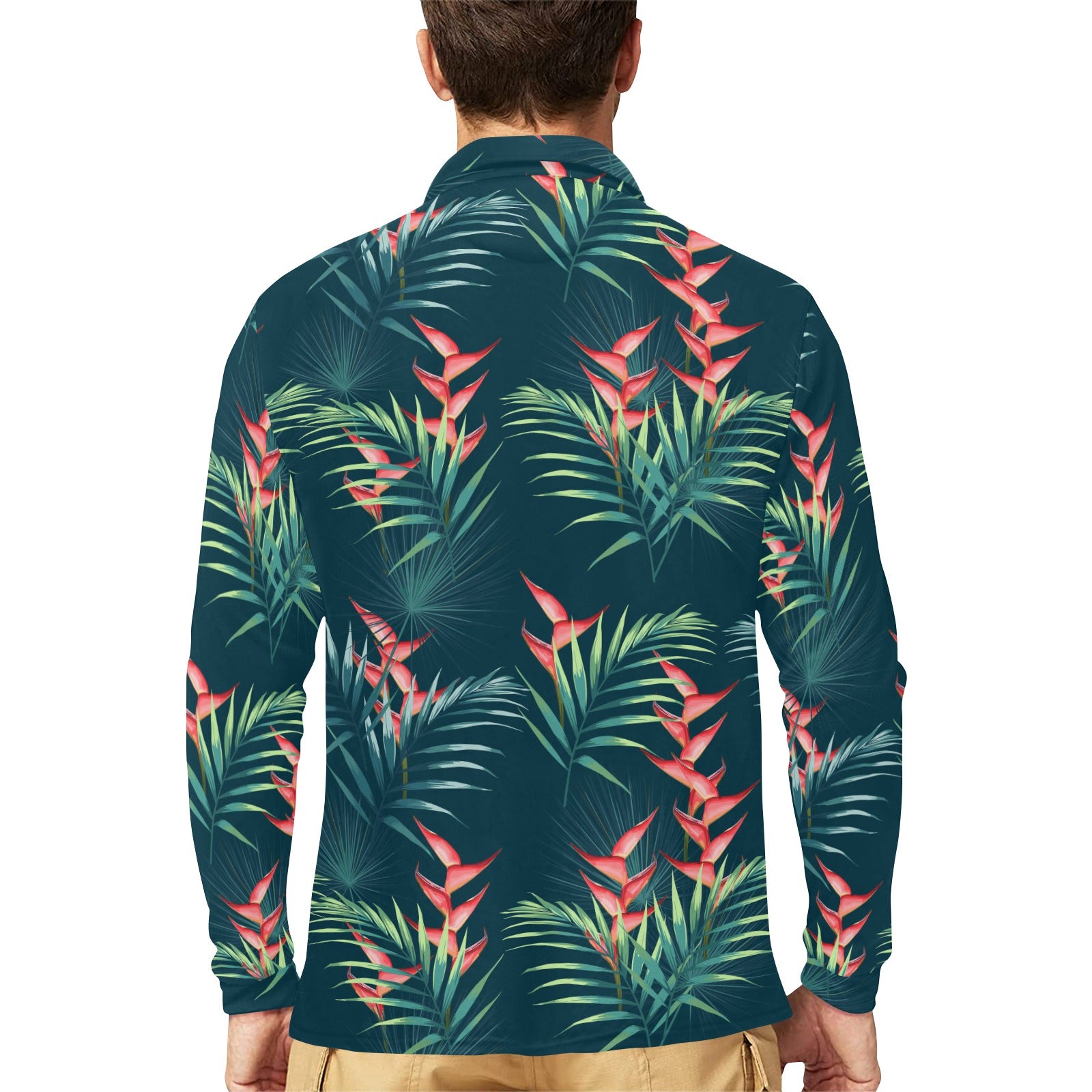 heliconia flowers, palm and monstera leaves on bla Men's Long Sleeve Polo Shirt