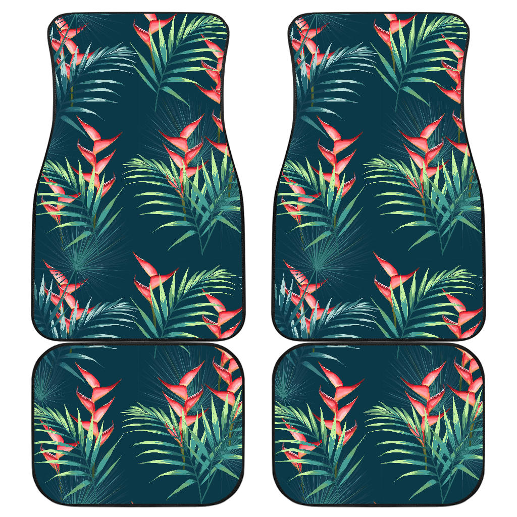 Heliconia Flowers, Palm And Monstera Leaves On Black Background Pattern Front And Back Car Mats