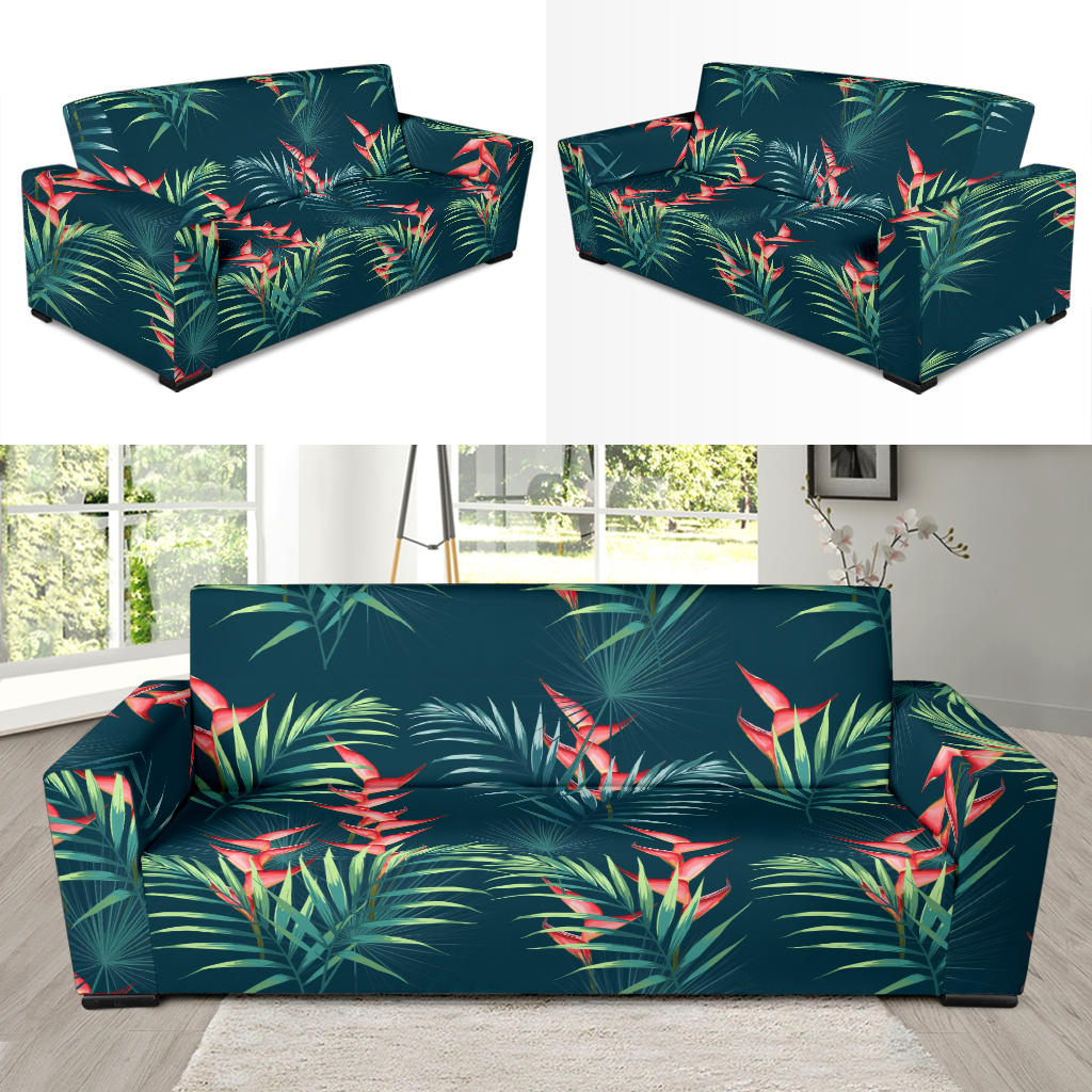 Heliconia Flowers, Palm And Monstera Leaves On Black Background Pattern Sofa Slipcover