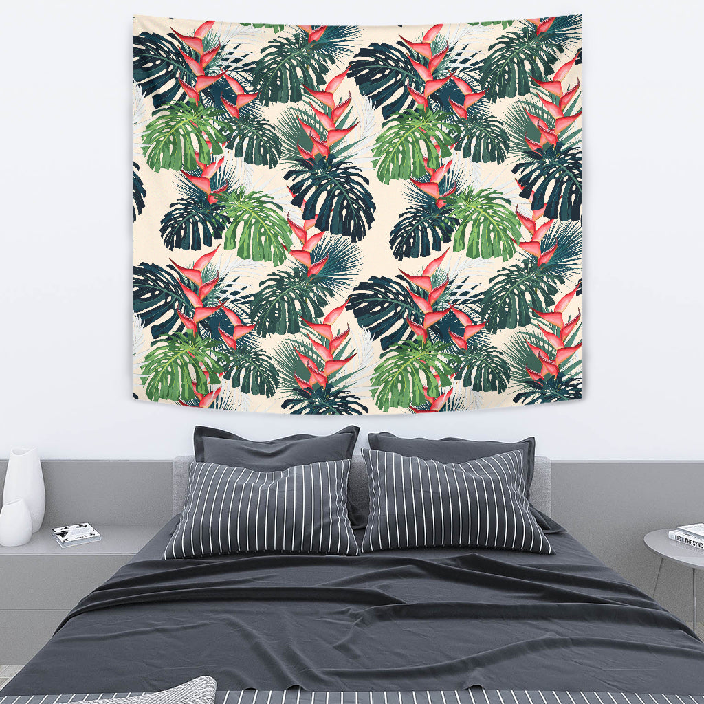 Heliconia Flowers, Palm And Monstera Leaves Wall Tapestry