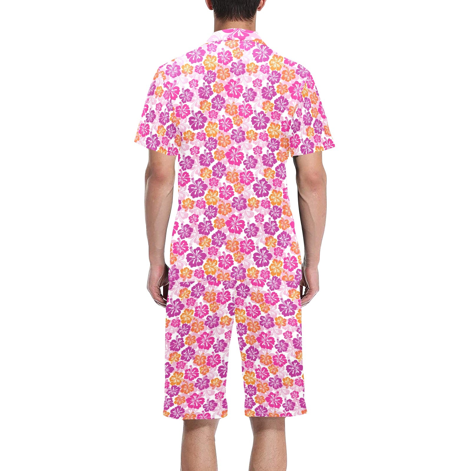 Hibiscus Pattern Print Design 01 Men's V-Neck Short Pajama Set