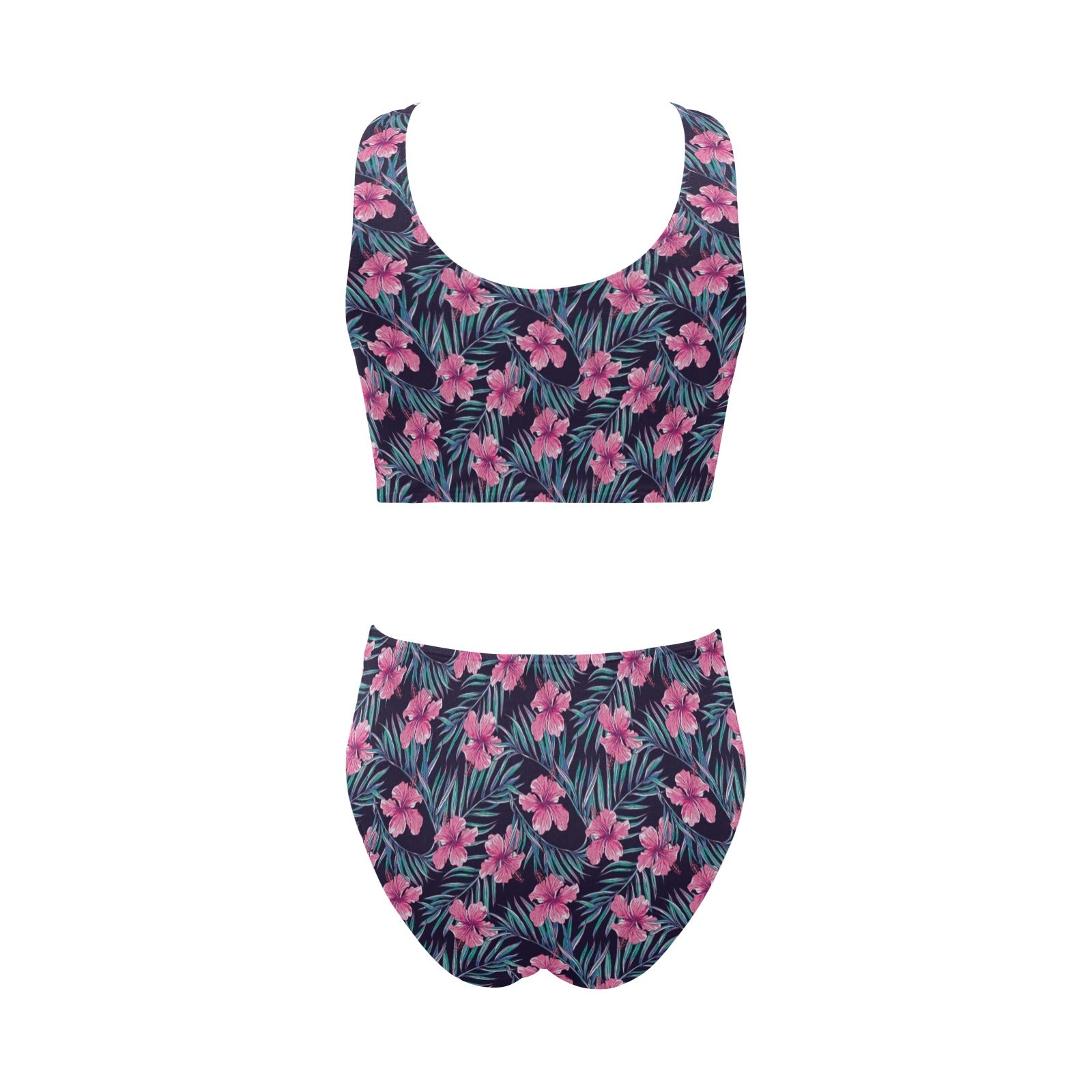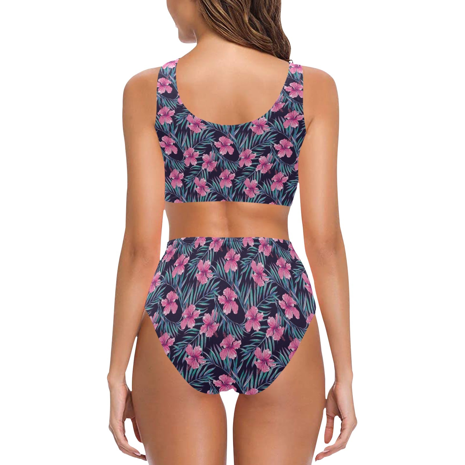 Hibiscus Pattern Print Design 05 Chest Bowknot High Waisted Bikini Swimsuit