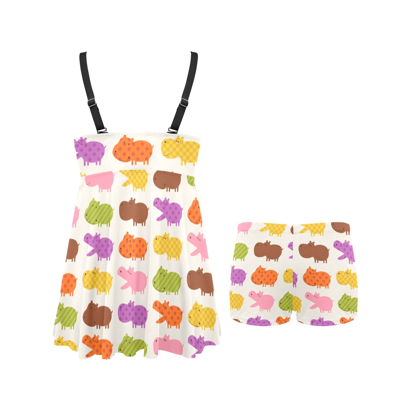 Hippopotamus Pattern Print Design 01 Chest Sexy Pleated Two Piece Swim Dress