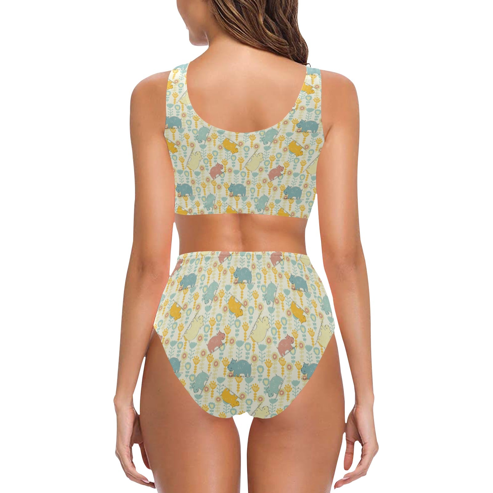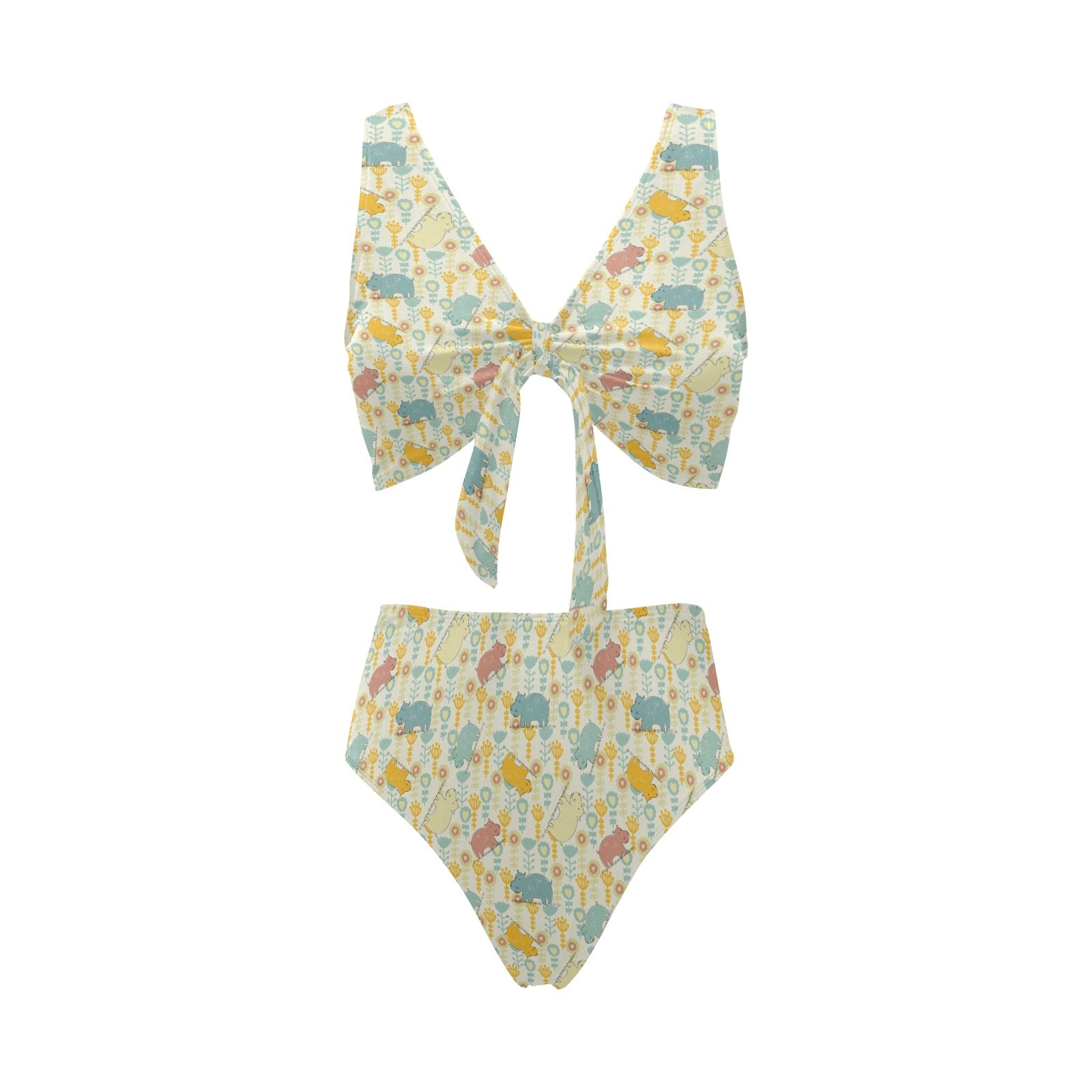 Hippopotamus Pattern Print Design 04 Chest Bowknot High Waisted Bikini Swimsuit