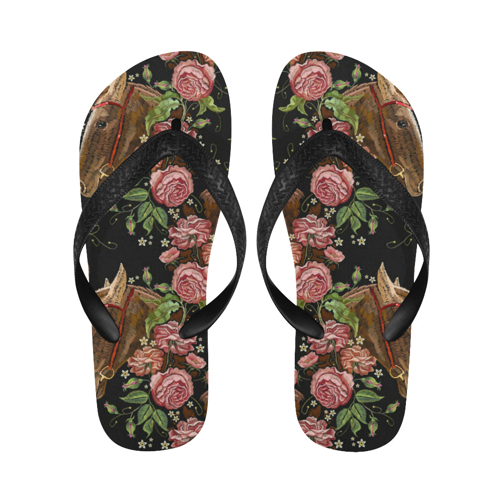 Horse head wild roses pattern Unisex Flip Flops is a uniqued design and limited item. It made to order, hand printed, and sewn with love in our factory.