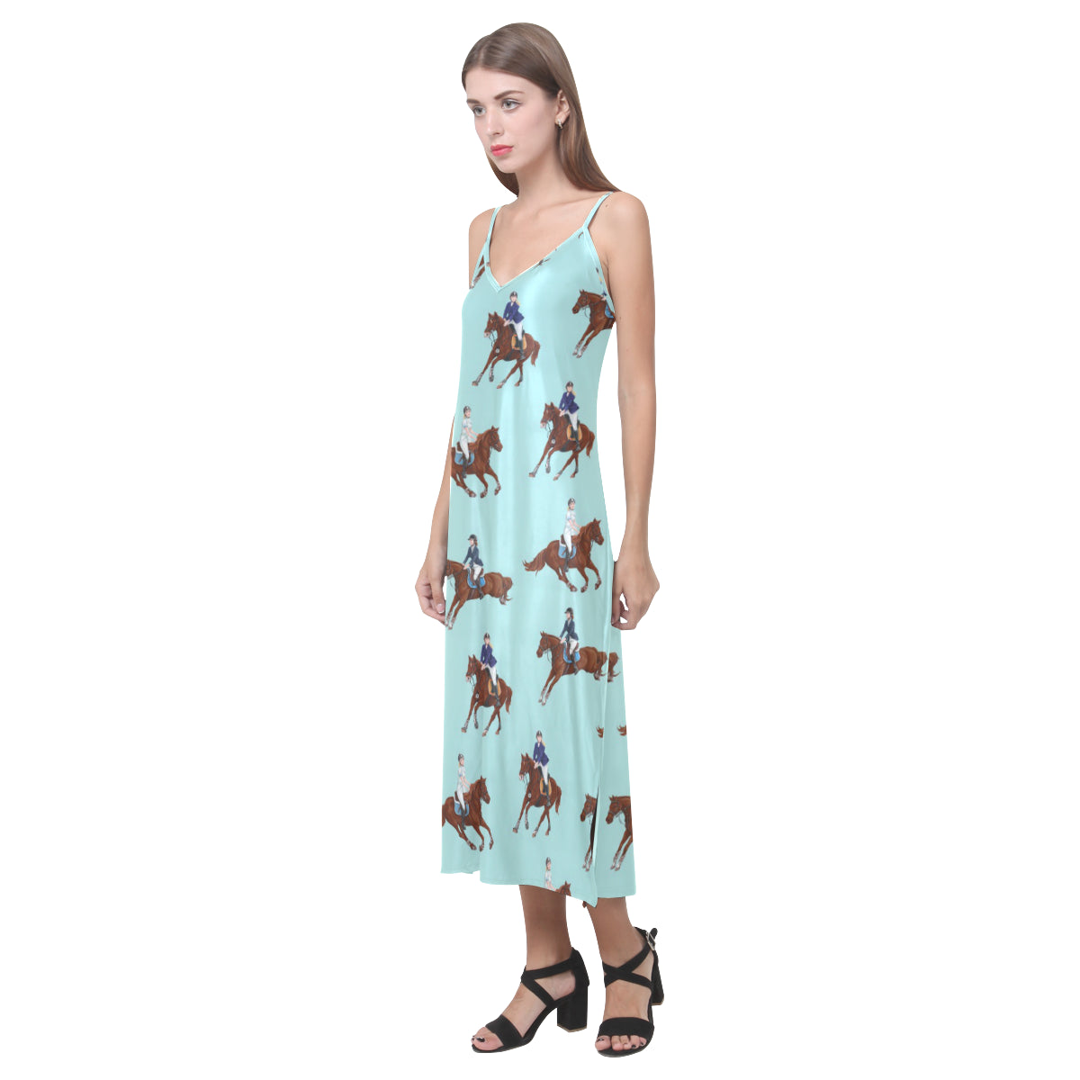 Horses running horses rider pattern V-Neck Open Fork Long Dress is a uniqued design and limited item. It made to order, hand printed, and sewn with love in our factory.
