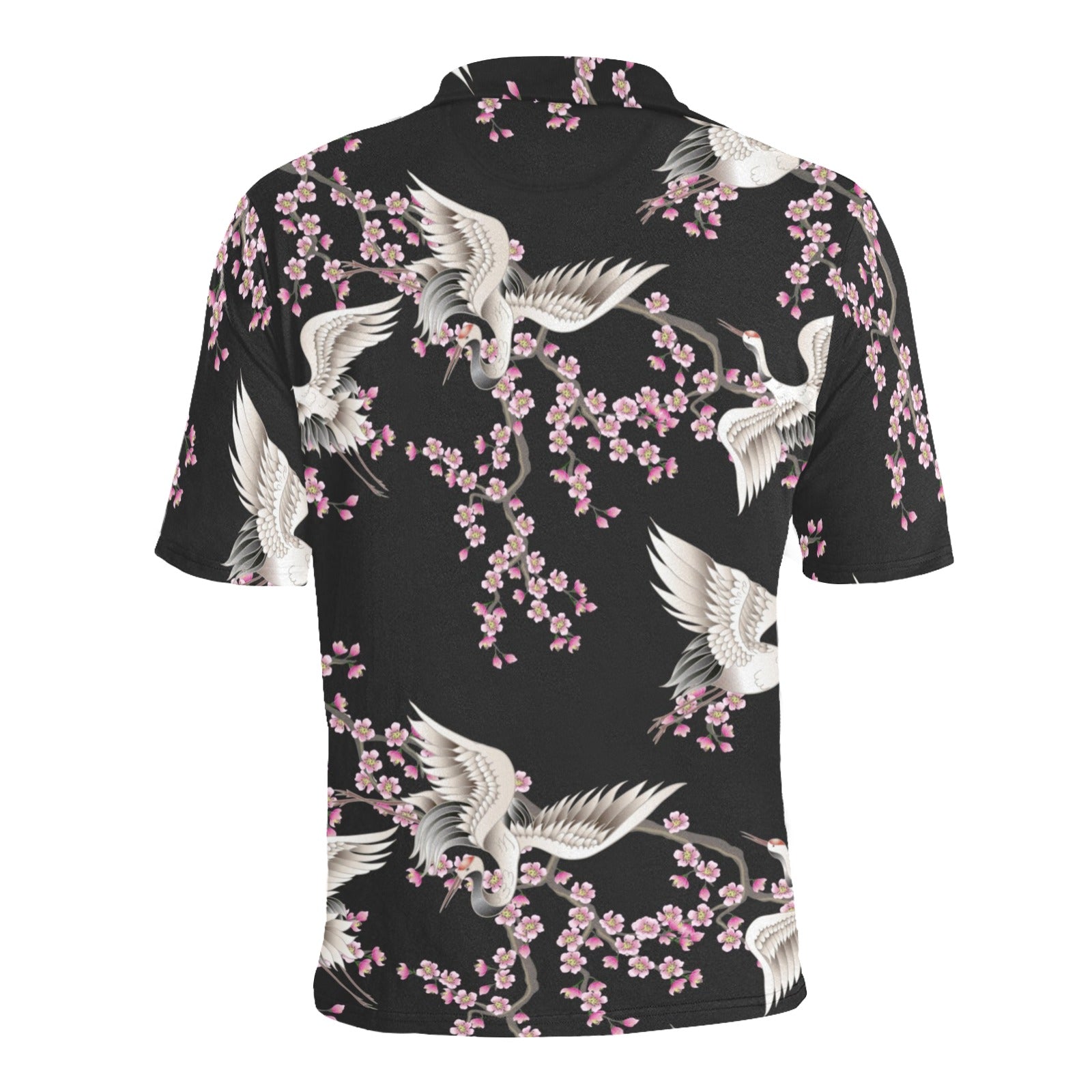 Japanese crane pink sakura pattern Men's All Over Print Polo Shirt